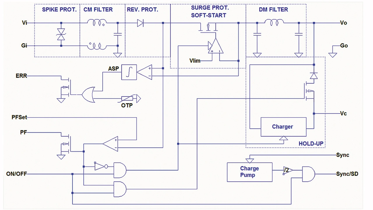 Außerdem verfügt das Modul über eine neuartige Topologie, bei der bis zu einer Eingangsspannung von 12 V ein kleiner Aufwärtswandler einen Kondensator auf einer konstant hohen Spannung hält. Fällt die Versorgung eingangsseitig aus, wird der Kondensator auf den nachgeschalteten DC-DC-Wandlereingang geschaltet, um den Ausfall zu überbrücken. Da die Energie bei hoher Spannung gespeichert wird und der DC-DC-Wandler bis 12 V arbeitet, bevor er ausfällt, ist nur ein relativ kleiner externer Kondensator (½CU2) erforderlich, um die Stufe S3 der EN 50155 zu erfüllen. Das Modul verfügt über einen Freigabeeingang, einen Fehlerausgang, einen Sanftanlauf (Softstart), eine Übertemperaturabschaltung und einen Überspannungsbegrenzungs-Schaltkreis zum Schutz vor Überlastung.