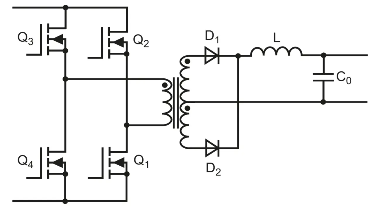 Push-Pull-, Halbbrücken- und Vollbrückenwandler sind Beispiele für andere isolierte Topologien. Bei der Push-Pull-Topologie werden zwei Schaltelemente verwendet, die sich den Strom untereinander aufteilen und für Anwendungen mit höherer Leistung geeignet sind. Diese Topologie arbeitet mit geteilten Primär- und Sekundärwicklungen mit Mittelanzapfung und benötigt einen wesentlich komplexeren und damit kostspieligeren Transformator. Die Halbbrücken- und Vollbrückentopologien ähneln der Push-Pull-Topologie, benötigen aber nur eine einzige Primärwicklung. Eine Halbbrücke verwendet zwei Schaltelemente und die Vollbrücke vier (Bild 6).