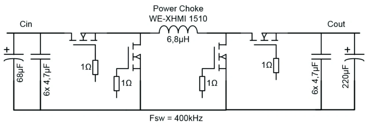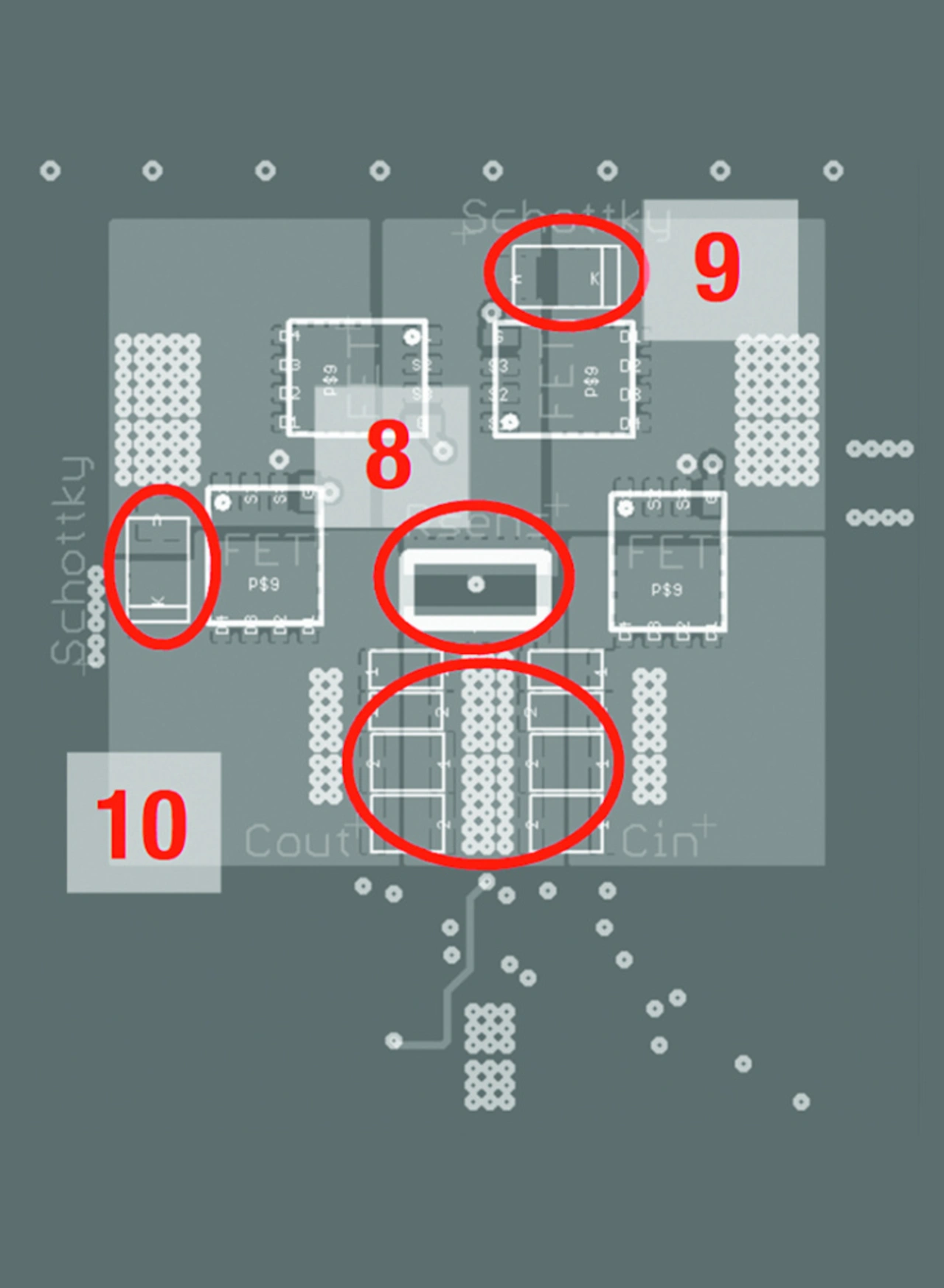 10. Große Kupferflächen sind eine hervorragende Wärmesenke und bieten einen geringen RDC, allerdings dürfen diese vor allem an den beiden »heißen« ΔU/Δt-Schaltknoten nicht unnötig groß werden, um keine ungewollte Antenne darzustellen. Des Weiteren ergibt sich eine bessere Kühlmöglichkeit für die Halbleiter auf der Leiterplattenunterseite, da keine weiteren großen Bauelemente eine thermische Anbindung verhindern. Die Eingangs- und Ausgangsschleifen mit hohem ΔI/Δt sind durch die örtlich enge Anordnung der Keramik-Stützkondensatoren zu den FETs sehr kompakt. Durch die geometrische Anordnung und die Verwendung von Kupferflächen ist die Anbindung der FETs sowie des Shunts untereinander sehr niederohmig und niederinduktiv.