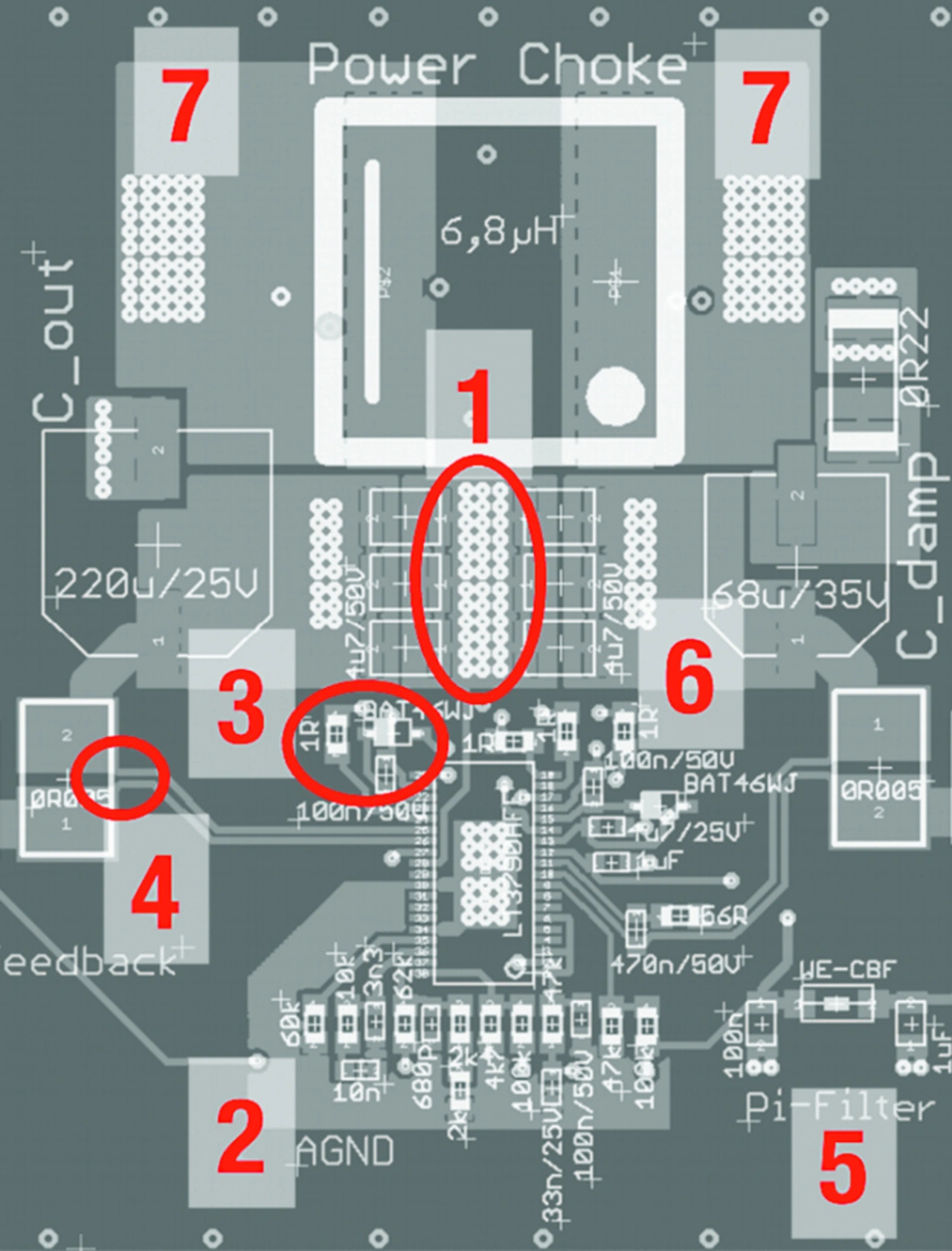 7. Große Kupferflächen sind eine hervorragende Wärmesenke und bieten einen geringen RDC, allerdings dürfen diese vor allem an den beiden „heißen“ ΔU/Δt-Schaltknoten nicht unnötig groß werden, um keine ungewollte Antenne darzustellen
