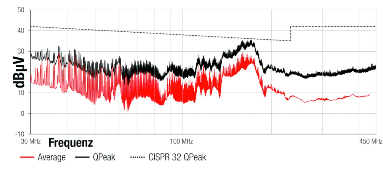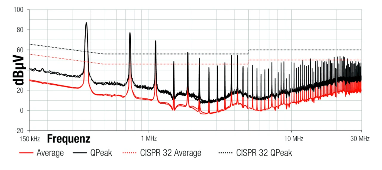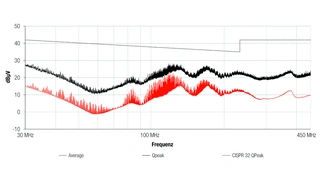 Die leitungsgebundene Störausstrahlung in Bild 7 zeigt erwartungsgemäß, dass die Grenzwerte der Klasse B trotz gutem Layout nicht einzuhalten sind.
