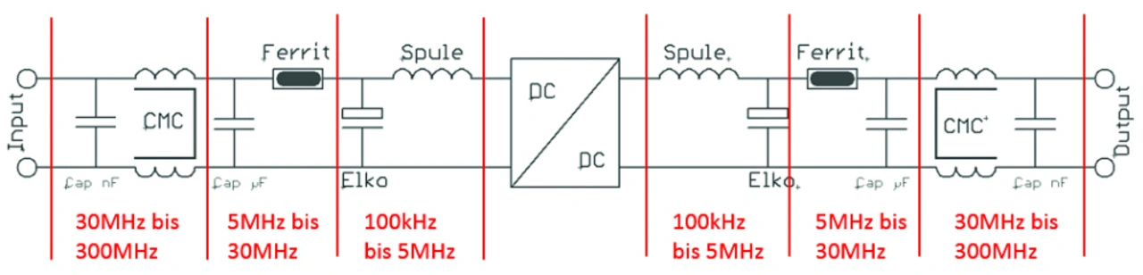 Das oberste Auswahlkriterium für die Bauelemente des Filters ist, dass sie eine breitbandige Entstörung von 150 kHz bis 300 MHz für leitungsgeführte und gestrahlte EMV ermöglichen. Der Filteraufwand lässt sich reduzieren, indem am Eingang bzw. Ausgang kurze oder gar keine Kabel verwendet werden. Bild 8 macht die Wirkbereiche der einzelnen Filterkomponenten im jeweiligen Frequenzbereich deutlich.