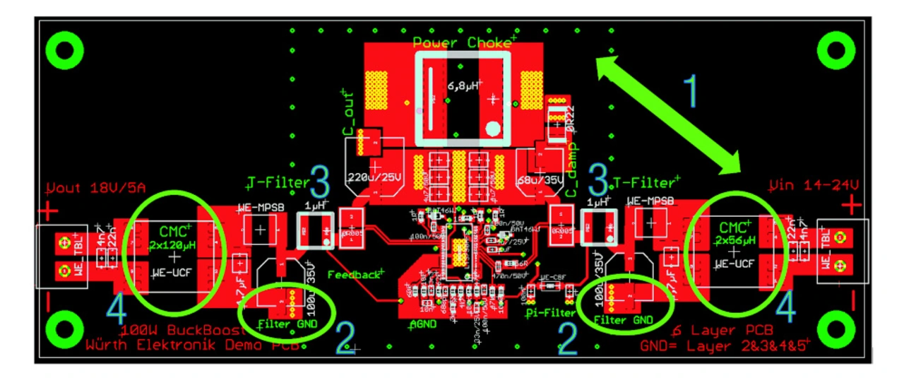 Beide Filterbänke sind so angeordnet, dass sich möglichst keine induktive und kapazitive Verkopplung mit dem Hauptteil der Schaltung ergibt, wodurch die Filterwirkung eventuell kompromittiert werden könnte. Die PGND-Kupferflächen in den Innenlagen werden nur an den beiden Aluminium-Elektrolyt-Kondensatoren des Filters angebunden. Unterhalb der Filterbänke ist auch in den Zwischenlagen kein Kupfer. Somit wird eine galvanische Verkopplung vermieden, welche die Entstörwirkung der Filterkondensatoren verringern würde. Die T-Filter sind so ausgeführt, dass möglichst keine unerwünschten kapazitiven und induktiven Verkopplungen innerhalb der drei Bauelemente stattfinden. Unter den beiden stromkompensierenden Drosseln wird das Kupfer freigestellt, um eine kapazitive Verkopplung zu minimieren. Die Auswahlkriterien für die stromkompensierten Drosseln waren: