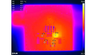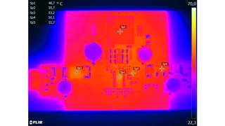 Bei 100 W Ausgangsleistung und einer Umgebungstemperatur von T = 22 °C ergibt sich eine gemessene Effizienz von 96,5 % im Buck-Mode und 95,6 % im Boost-Mode. Die maximale Bauteiltemperatur liegt unter 64 °C (Bild 10 und 11 der Bildergalerie unten), was einen guten Spielraum für höhere Umgebungstemperaturen sowie einen geringen Stress für die Bauelemente bedeutet. Der Wirkungsgrad bewegt sich ebenfalls auf einem sehr hohen Niveau, besonders, wenn man bedenkt, dass hierbei alle Bauelemente für die Filter bereits berücksichtigt sind.