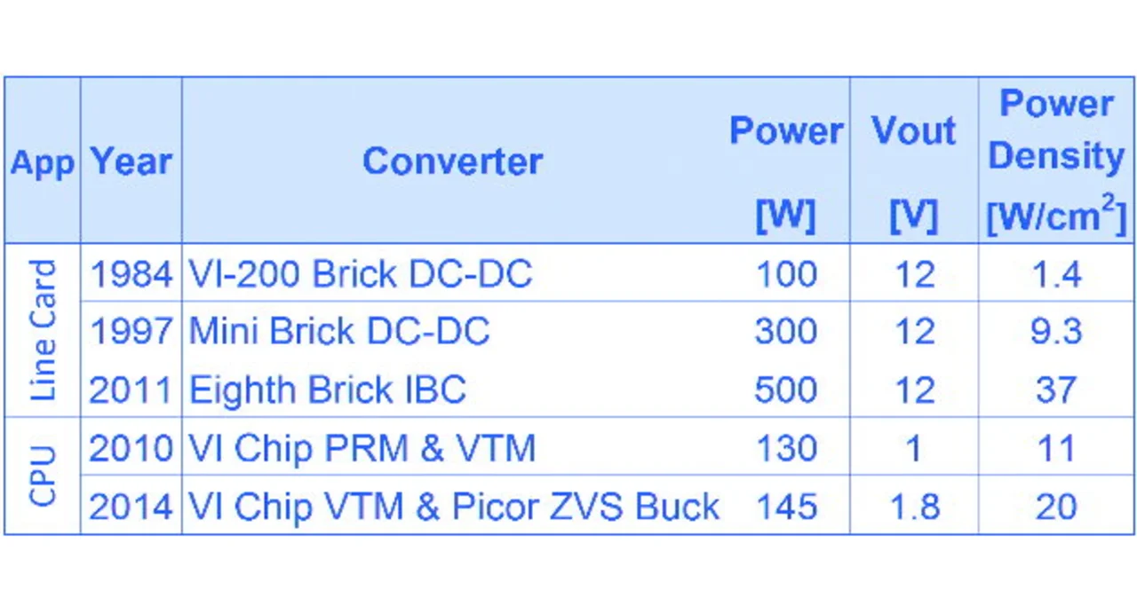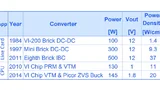 Durch die Weiterentwicklung der Topologien für die Leistungsumwandlung, der Schaltelemente und der Gehäusetechnologien für Powerkomponenten stiegen die mögliche Leistung pro Gehäuse und die allgemeine Leistungsdichte (Bild und Tabelle). Die Leistungsdichte allein ist jedoch nicht das allein bestimmende Merkmal, speziell im Fall der Umwandlung von 48 V auf einen Ausgang mit ca. 1 V für CPU-Applikationen.