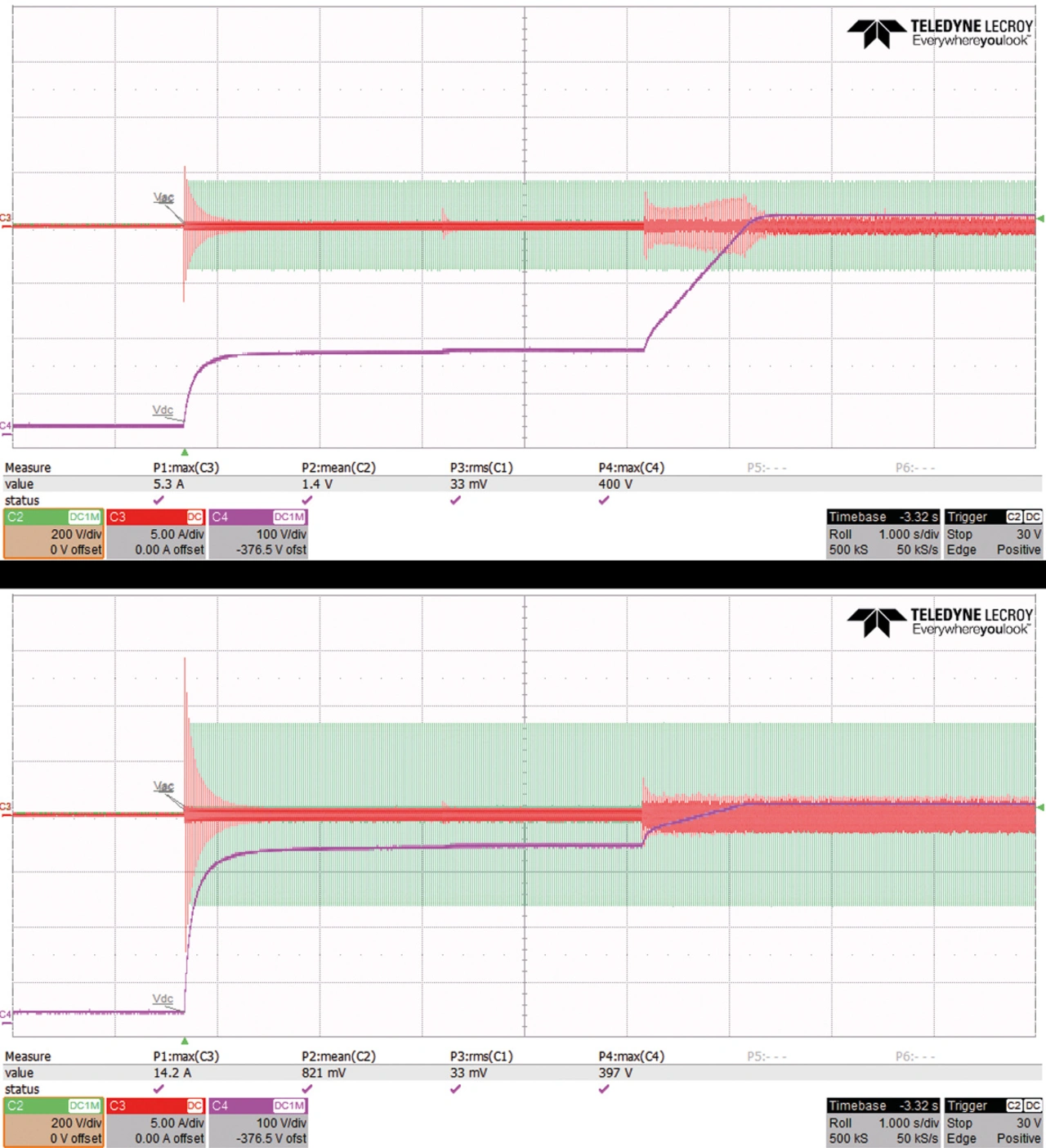 Das TP-PFC-EVK ist mit einem PTC-Thermistor für die Vorladung in Kombination mit einem Bypass-Relais ausgestattet. Beim Einschalten werden das Relais ausgeschaltet und die Kondensatoren durch den PTC-Thermistor bis zu einem sicheren Schwellenwert vorgeladen, bevor das Relais eingeschaltet und der Umrichter in Betrieb genommen wird. Dadurch wird eine Beschädigung des Stromkreises durch hohe Einschaltströme verhindert. Das EVK wurde über den gesamten AC-Eingangsbereich (85 V bis 265 V) getestet und hat sich für einen automatischen Start selbst bei 265 V als geeignet erwiesen (Bild 3). Dank des implementierten Second Order Generalized Integrator - Frequency Locked Loop (SOGI-FLL) kann dieses EVK auch Drifts in der Netzfrequenz von 50 Hz ±3 Hz oder 60 Hz ±3 Hz verfolgen und erkennen.