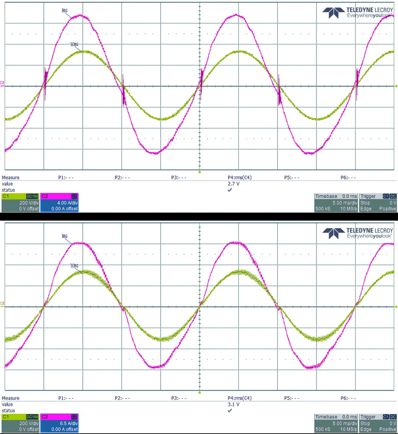 Im 3,6-kW-TP-PFC-EVK von Rohm ist die im vorigen Abschnitt erläuterte Steuerungssequenz implementiert und getestet. Ohne diese Steuerungsmethode, das zeigen die Testergebnisse, wären sowohl negative als auch positive Stromspitzen vorhanden. Damit führt die Anwendung des Soft-Starts sowohl auf aktive als auch auf synchrone MOSFETs sowie das Einschalten der Niederfrequenz-MOSFETs zum richtigen Zeitpunkt zu besseren Stromkurven und einem wesentlich geringeren Klirrfaktor.