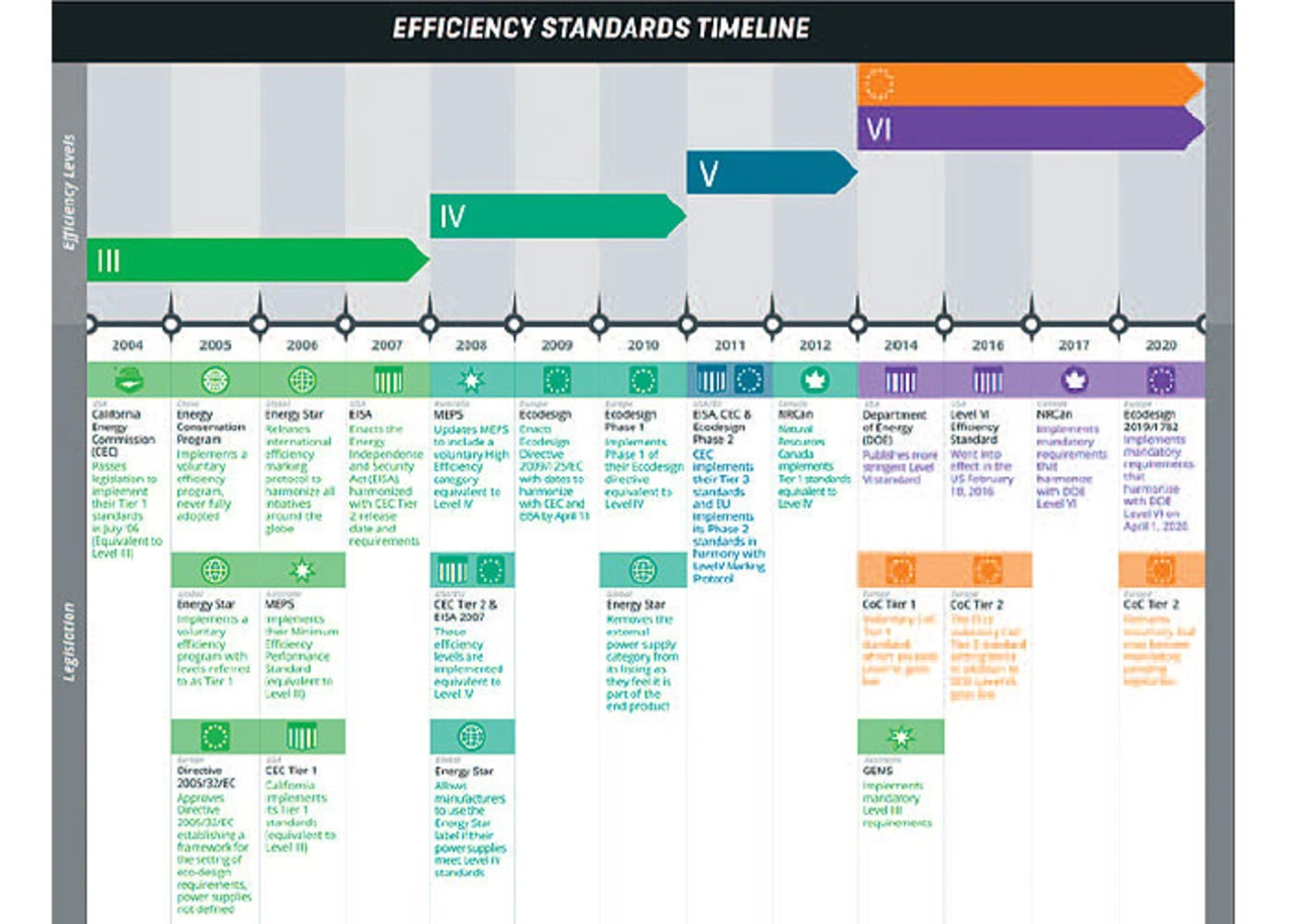 So muss zum Beispiel die Leistungsaufnahme vieler Netzteile im Leerlauf den Effizienzstandards entsprechen, die inzwischen in zahlreichen Regionen und Ländern gelten (Bild 2). In den USA muss der Level-VI-Standard des US-Energieministeriums (DoE) eingehalten werden – historisch basierend auf dem ersten Standard der California Energy Commission aus dem Jahr 2004. Dieser Standard gilt jetzt in den gesamten USA und legt fest, wie effizient ein externes Netzteil sein muss und wie viel Stand-by-Strom es aufnehmen darf. So muss ein externes Netzteil, das eine einzelne Gleichspannung mit einer Leistung über 250 W bereitstellt, einen Wirkungsgrad von mindestens 87 Prozent aufweisen und im Leerlauf weniger als 0,5 W aufnehmen.