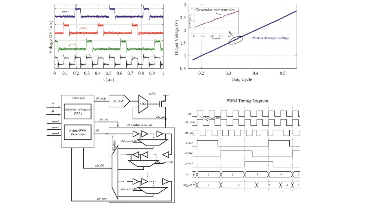 Damit die Auflösung der drei phasenverschobenen PWM-Signale ausreichend hoch ist, kommt eine hybride Pulsbreitenmodulation zum Einsatz. Sie besteht aus einem Zähler und einem Verzögerungsglied (Bild 3, links unten). Ein auf dem Chip integrierter Linearregler (LDO) versorgt das 8-Bit-Verzögerungsglied (8b Tunable Delay Line). Der LDO wird über einen D-A-Wandler (10b DAC) mit 10 Bit Auflösung gesteuert, sodass sich die Versorgungsspannung am Verzögerungsglied ändert, was wiederum dessen Verzögerung moduliert. Eine digitale Delay-Line-Calibration (DLL) regelt den LDO so, dass die Verzögerung des Verzögerungsglieds mit dem Referenztakt (CLK), aus dem sich die PWM-Frequenz ableitet, zusammenpasst. Dabei unterteilt sich jeder PWM-Zyklus in sechs Abschnitte bzw. Takte, sodass die drei PWM-Kanäle also um jeweils zwei dieser Abschnitte phasenverschoben sind.