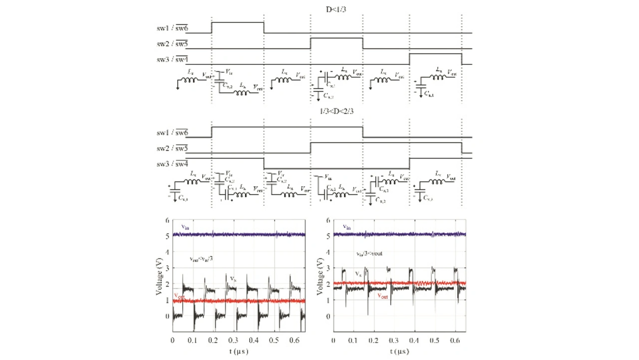 Die Leistungsschalter arbeiten in komplementären Paaren (S1/S6, S2/S5, S3/S4), wobei jedes Paar über jeweils ein PWM-Signal gesteuert wird, das um 120° gegenüber dem des benachbarten Schalterpaar phasenverschoben ist. Bei jedem Schalten der PWM ändert sich die Spannung Vx, und die effektive Schaltfrequenz ist dreimal höher ist als die native PWM-Frequenz. Dies reduziert die Schaltverluste im Vergleich zu anderen Topologien deutlich, da jedes Bauelement nur jede dritte Schaltperiode ein- und ausgeschaltet wird. Gemessene Wellenformen (Bild 2, unten) veranschaulichen den Betrieb in zwei verschiedenen Bereichen eines Arbeitszyklus, wobei sich Vx entweder zwischen 0 und 1/3 Vin (Tastverhältnis D < 1/3) oder zwischen 1/3 Vin und 2/3 Vin (1/3 < D < 2/3) ändert.