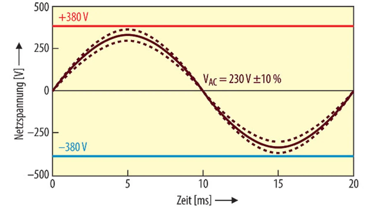 Die elektrischen Anwendungen werden dabei - je nach Leistung - entweder an eine einphasige Gleichspannung von 380 V oder an eine zweiphasige Gleichspannung von 760 V angeschlossen. Eine „Phasen“-Gleichspannung von 380 V ist vorteilhaft, weil diese Spannung bereits heute in vielen Anwendungen intern verwendet wird. In Europa liegt eine Phasen-Gleichspannung von 380 V etwas oberhalb der maximalen Netzspannungsamplitude von 358 V (110 % × √2 × 230 V) (Bild 3).