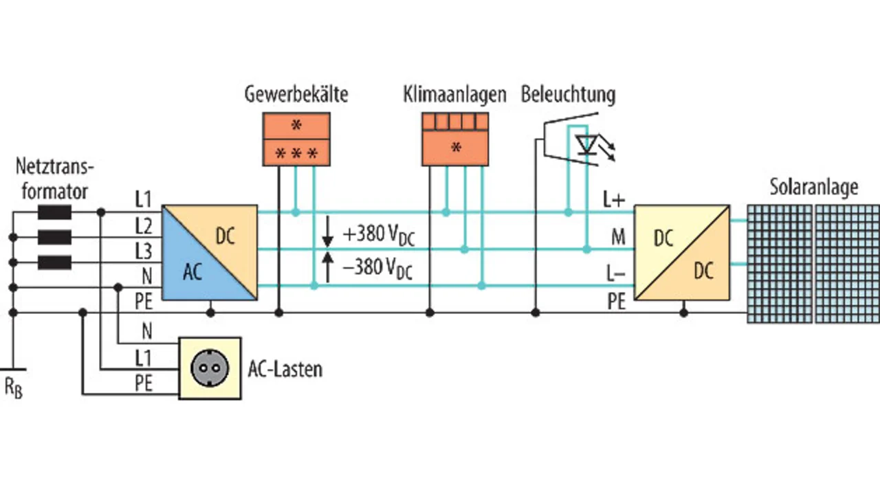 Durch zentrale Gleichrichter und eine Elektrizitätsverteilung mit Gleichspannung können in Gebäuden Kosten für Schaltnetzteile reduziert und die Effizienz der Nutzung lokaler regenerativer Energien gesteigert werden.