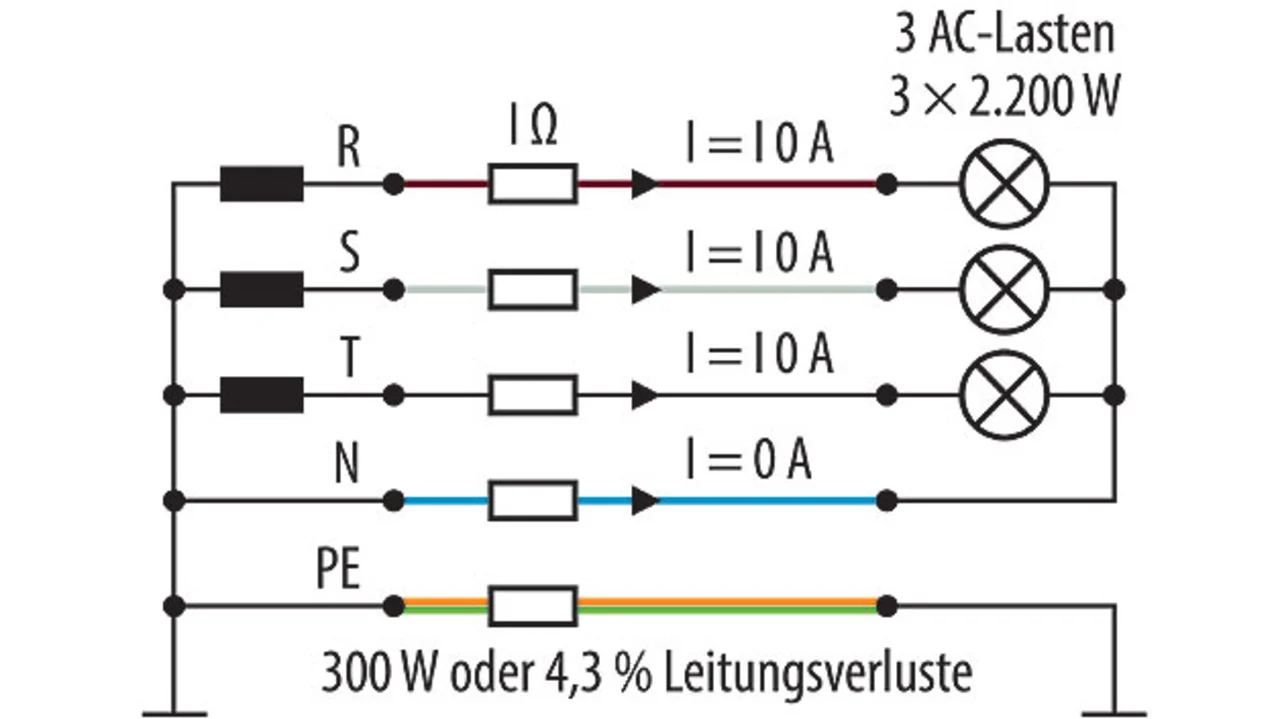 Das vorgeschlagene Gleichstromnetz hat gegenüber Drehstrom verschiedene Vorteile. Bild 4 illustriert Leitungsverluste durch reinen Wirkstrom in einer 400-V-Drehstromleitung anhand eines Beispiels, in dem drei Lastgruppen mit zusammen 6.600 W versorgt werden. Der Leiterstrom von 10 A verursacht an dem angenommenen Leiterwiderstand von 1 Ω einen Spannungsabfall von 10 V und damit Verluste von 300 W, das entspricht 4,3 % der Eingangsleistung des Kabels. Im Neutralleiter N fließt kein Strom, weil sich die drei Phasenströme mit einer Phasenverschiebung von jeweils 120 Grad zu Null addieren. Eine zusätzliche Blindleistungsübertragung im Kabel würde die Verluste weiter erhöhen.