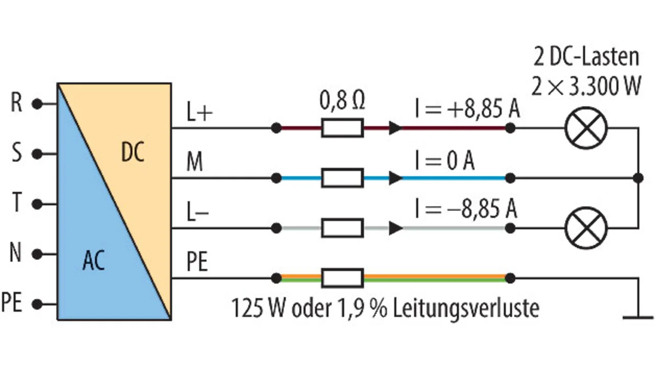Wird bei einer Gleichstromübertragung der gleiche Gesamtleiterquerschnitt für das Kabel wie im Beispiel Drehstrom berücksichtigt, dann folgt daraus ein um 25 % größerer Leiterquerschnitt, da für die zwei Phasen im Gleichstromnetz ein Leiter weniger erforderlich ist (Bild 5). Damit reduziert sich der Leiterwiderstand um 20 % auf 0,8 Ω. Um nun die zwei Lastgruppen mit ±380 V und einer Gesamtleistung von 6.600 W zu versorgen, sind zwei Phasenströme von jeweils 8,85 A erforderlich. Diese Phasenströme erzeugen im Gleichstromkabel Verluste von 125 W, das entspricht hier 1,9 % der Eingangsleistung des Kabels. Damit sind die Kabelverluste im Gleichstrombeispiel um 58 % geringer als die Verluste im Drehstromkabel bei gleichem Gesamtleiterquerschnitt. Allgemeiner ausgedrückt halbieren sich die Leitungsverluste durch den Übergang von einer Drehstromübertragung auf die vorgeschlagene Gleichstromübertragung durch den höheren Effektivwert der Spannungen im Gleichstromnetz. Zusätzliche Verluste durch Blindstrom können im Gleichstromleiter prinzipiell nicht entstehen. Alternativ kann man ein Gleichstromkabel vom Gesamtquerschnitt so dimensionieren, dass die gleichen Kabelverluste von 300 W wie im Drehstrombeispiel entstehen. Hierfür kann der Leiterwiderstand von 0,8 auf 1,8 Ω ansteigen. Der Gesamtleiterquerschnitt des Gleichstromkabels reduziert sich dadurch um 56 %.