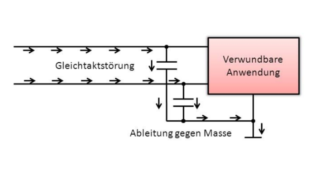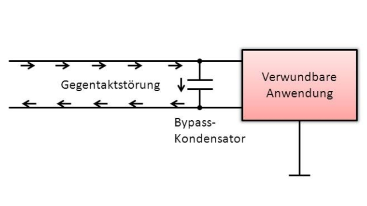 Gegentaktrauschen (Differential Mode Noise, Bild 1) lässt sich durch Bypass-Kondensatoren unterdrücken, die zwischen den stromführenden Hin- und Rückleitungen eingebaut werden. Die zu filternden Leitungen können sich am Eingang oder am Ausgang des Netzteils befinden. Die Bypass-Kondensatoren auf diesen Leitungen müssen in der Nähe der Anschlüsse angebracht sein, an denen sich die Störquelle befindet. Nur so lassen sich Störungen effizient unterdrücken. Dies gilt besonders für die Dämpfung derartiger Ströme bei hohen Frequenzen.