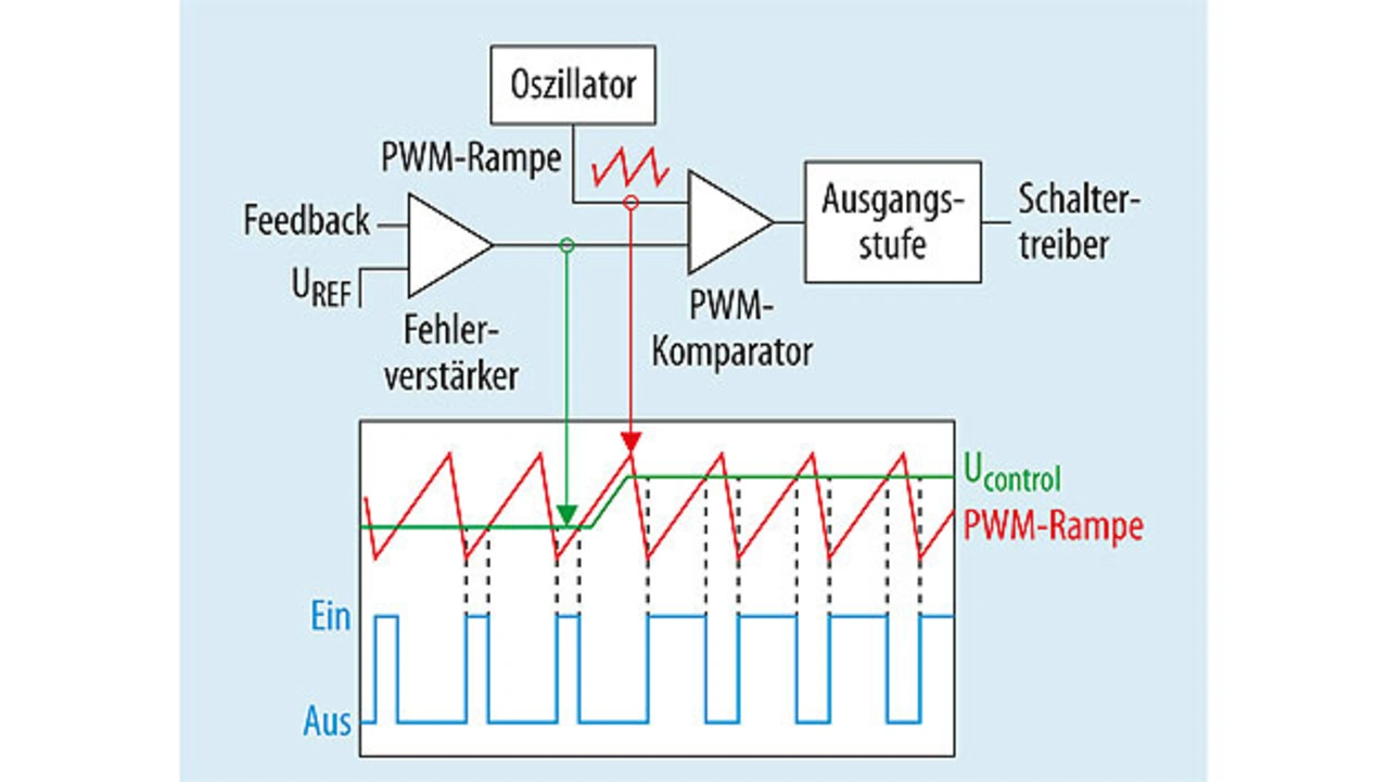 Um die Ausgangsspannung über einen vorgegebenen Eingangsspannungs- und Laststrombereich konstant zu halten, wird ein Konzept benötigt, das die Ausgangsspannung überwacht und die Einschaltzeiten steuert. Um ein variierendes Tastverhältnis von SW1, die sogenannte Pulsweitenmodulation (PWM), zu erreichen, wird zunächst ein Fehlerverstärker genutzt.