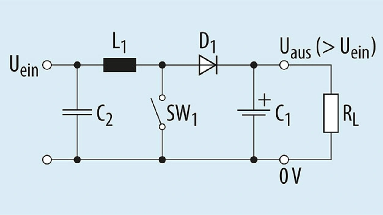 Wenn die Ausgangsspannung höher als die Eingangsspannung sein muss, können dieselben Komponenten in der Aufwärtswandler-Konfiguration in Bild 6 angeordnet werden. Im Abwärtswandler fließt der Strom während der Einschaltzeit direkt vom Eingang zum Ausgang und die in der Induktivität gespeicherte Energie springt ein, wenn der Schalter aus ist.