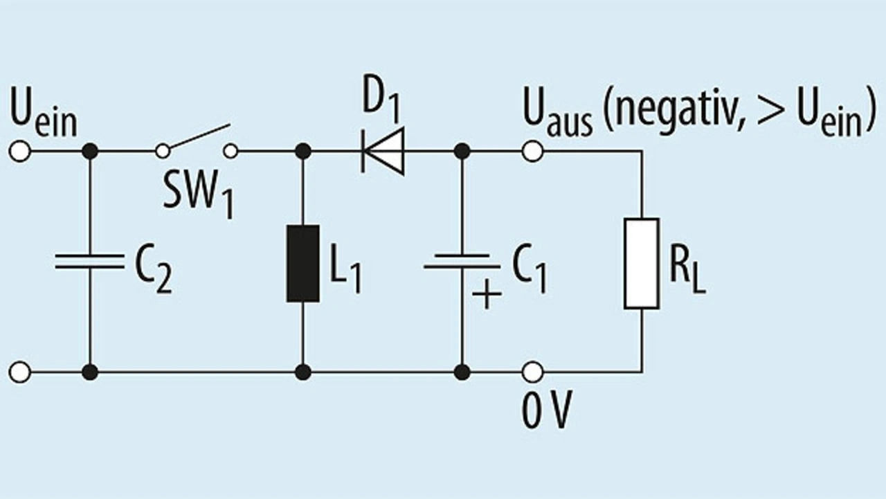 Es ist noch eine weitere Neuanordnung derselben Komponenten bezüglich der Ein- und Ausgänge möglich. Das Ergebnis ist der Aufwärts-/Abwärtswandler (Bild 7). Bei diesem ist die Polarität der Ausgangsspannung invertiert oder negativ im Verhältnis zur Eingangsspannung. Der Betrag von Uaus kann mit der Tastverhältnissteuerung auf jeden Wert zwischen Null und jedem beliebig hohen negativen Wert eingestellt werden. Auch in diesem Fall kann das Wandlungsverhältnis mit ähnlichen Regeln wie beim Abwärtswandler hergeleitet werden: