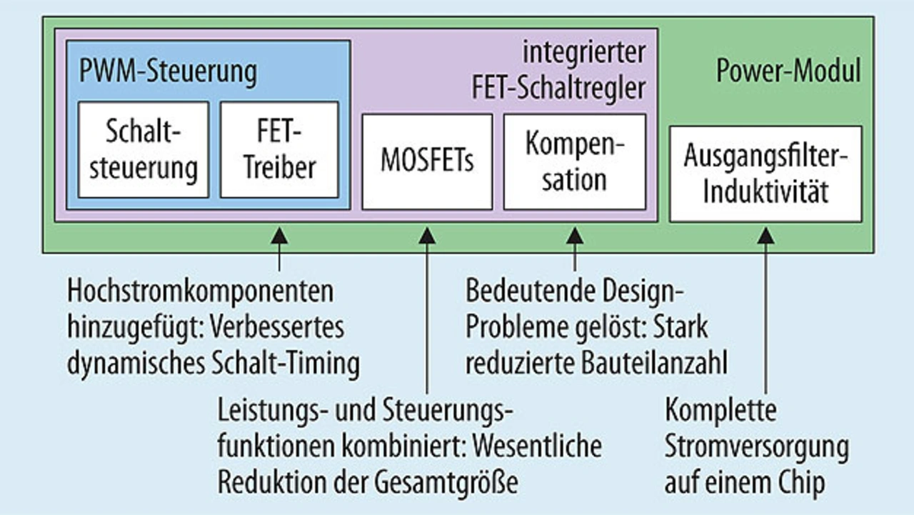 Ein zweiter Schritt der Integration kam mit der Aufnahme der Treiberstufe in den Chip. Ein großer Sprung nach vorne war dann die Integration der Leistungs-MOSFETs selbst. Als nächstes erfolgte die Einbindung von Elementen zur Programmierung und Schleifenkompensation. Das hilft dabei, die Gesamtzahl der Komponenten zu verringern und befreit den Entwickler von der oft iterativen Aufgabe der Schleifenstabilisierung.
