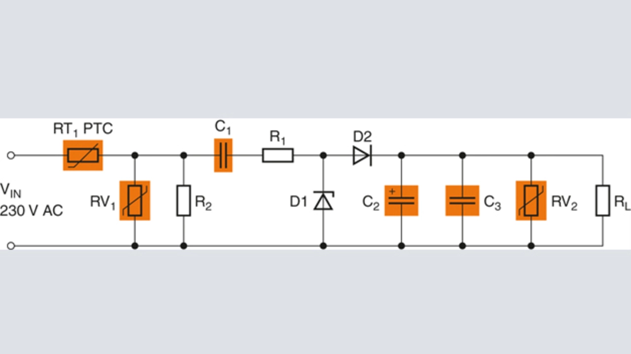Zur Funktion der Zenerdiode D1: Während der positiven Halbwelle arbeitet D1 als spannungsbegrenzendes Bauelement. Um die Ausgangsspannung von 9 V zu erreichen, müsste die Zenerspannung bei 9,7 V liegen, weil an der Diode D2 rund 0,7 V abfallen. Da Zenerdioden mit diesem Wert aber nicht verfügbar sind, wird eine Diode mit 10 V und einer zulässigen Verlustleitung von 1,3 W gewählt. Wird die Stromversorgung im Scheitelpunkt der Netzspannung eingeschaltet, würde ein zu hoher Strom durch D1 fließen. Er wird mit R1 begrenzt. Zenerdioden mit einer Verlustleistung von 1,3 W können in der Regel kurzfristige Ströme von etwa 1 A bewältigen. So lässt sich der Wert von R1 nach Gleichung (1) berechnen. Der nächstgelegene Normwert ist 330 Ω.