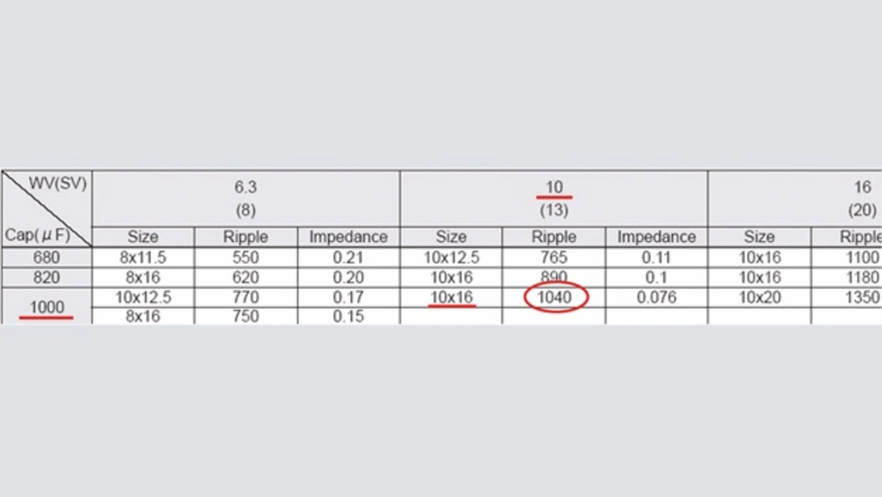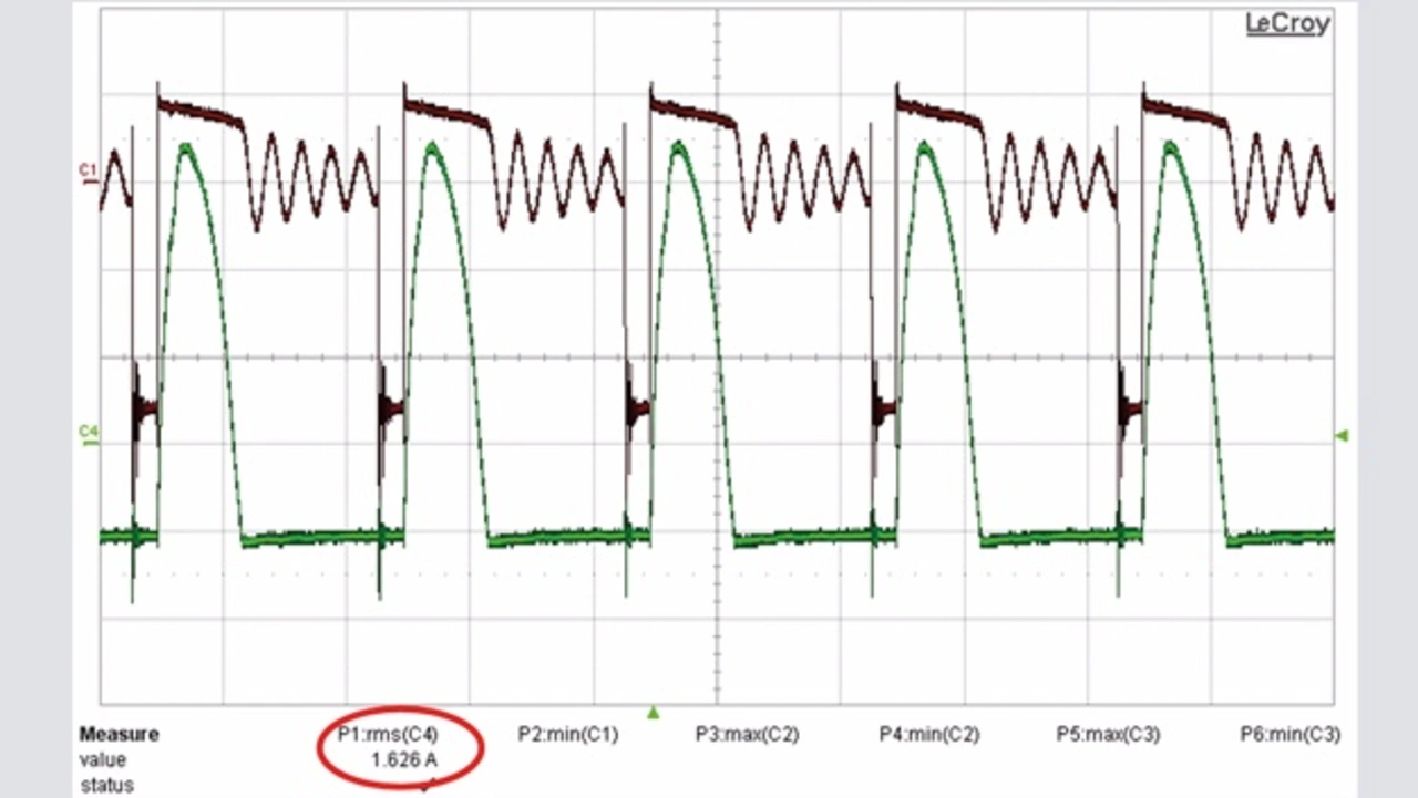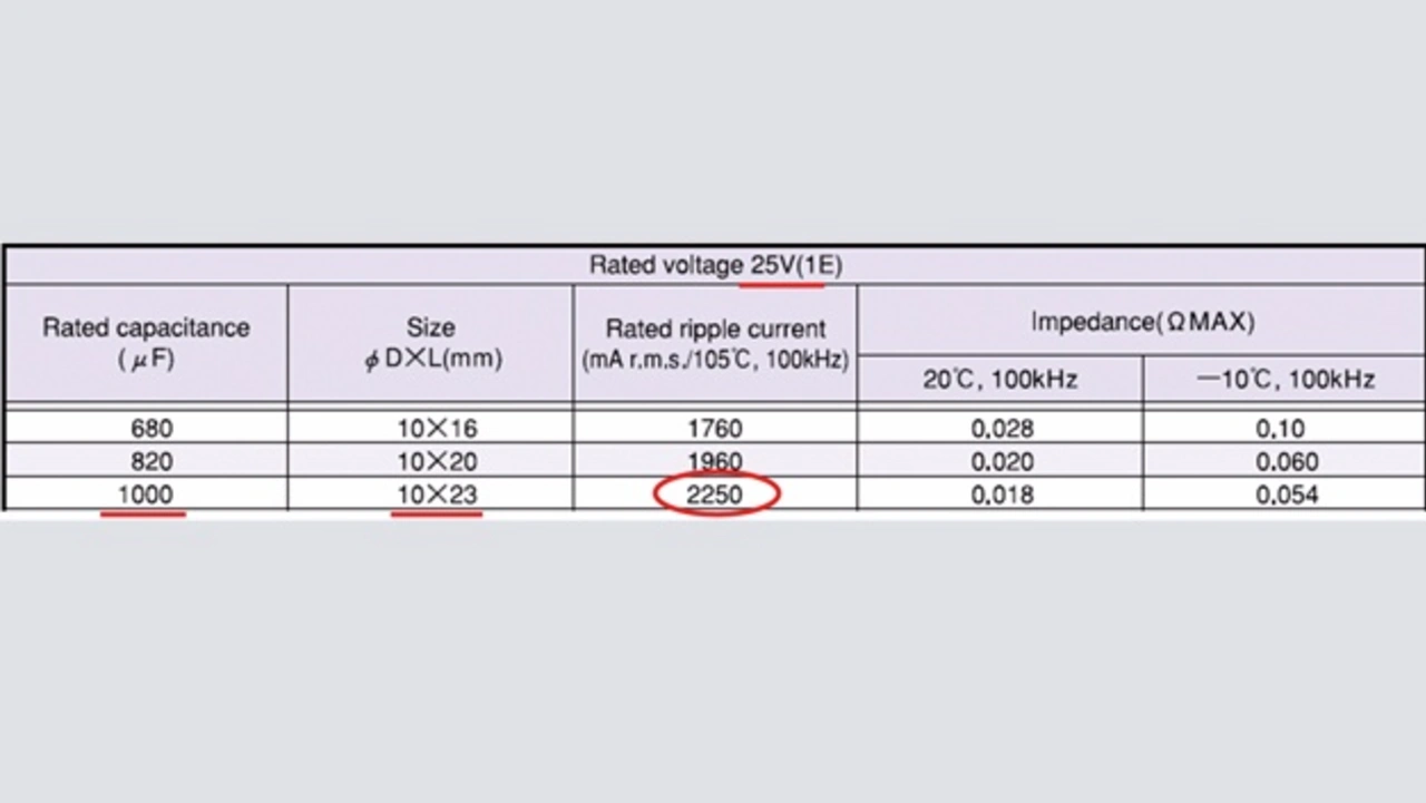 Wichtig ist auch, die Datenblätter aller in der Stückliste zugelassenen Elektrolytkondensatoren genau zu überprüfen. Bild 4 zeigt ein Negativbeispiel. Der gemessene Strom im Elko beträgt 1,62 A (Bild 5), spezifiziert aber ist er nur bis 1,04 A (Tabelle 1).