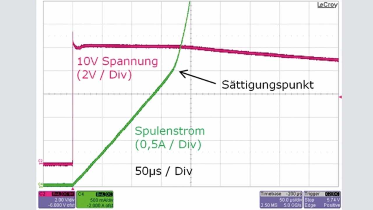 Der kritischste Fall tritt nicht nur bei kleinster Eingangsspannung und größter Last auf, sondern oft beim Anlauf. Am besten, man testet alle statischen und dynamischen Betriebsfälle. Zudem hängt die Sättigung von der Temperatur und Bauteiltoleranzen ab. Erkennt man auf dem Labortisch zum Beispiel beim Start ein »bisschen Sättigung«, so kann diese im Gerät bei höherer Innentemperatur oder über eine größere Stückzahl wesentlich kritischer sein und zu Feldausfällen führen.