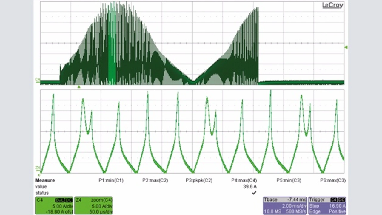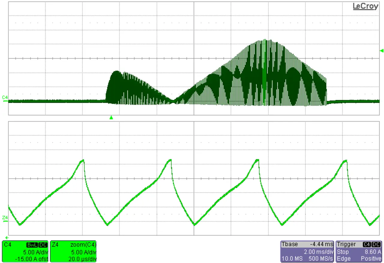 Ein Kunde aber baut davon jährlich 250 Exemplare in seine Medizingeräte ein und hat etwa 40 Ausfälle pro Jahr. Die Analyse der Feldrückläufer ergab, dass immer die Netzsicherung ausgelöst hat und der PFC-Transistor defekt war. Die genaue Analyse ergab, der Transistor war während des Betriebs keiner Übersspannung und keinem Überstrom ausgesetzt. Beim Anlauf jedoch ging die PFC-Spule etwas in Sättigung (Bild 7), unabhängig vom Wert der Netzspannung oder der Last.