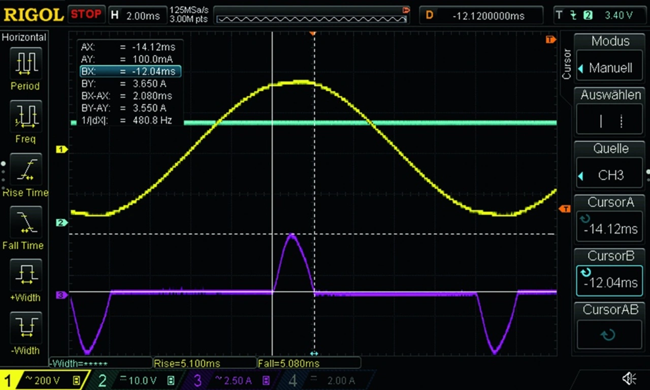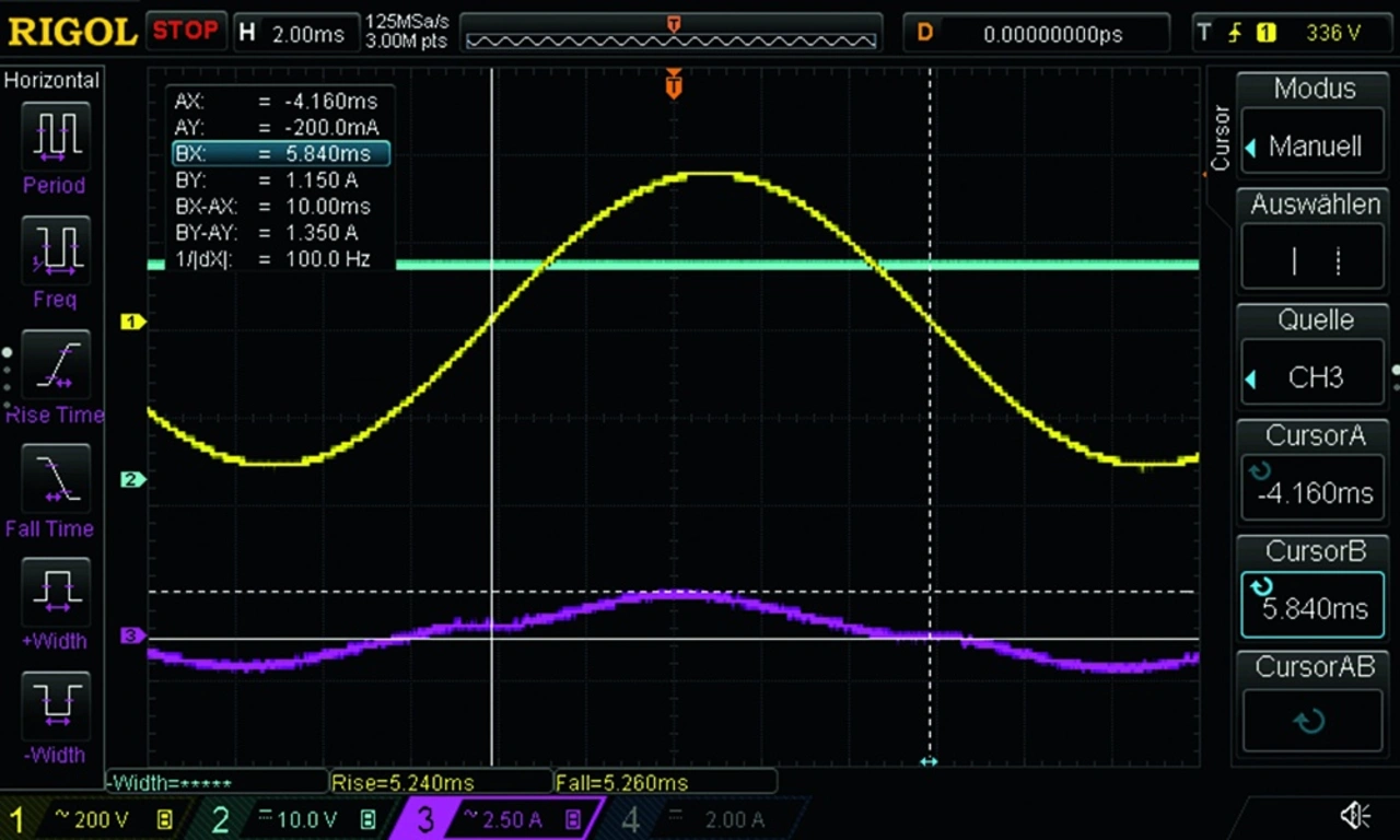 Messungen auf der Primärseite sind in aller Regel komplizierter durchzuführen. Neben der höheren Netzspannung per se, sind durch die Beschaltung mit einem Gleichrichter und nachfolgendem Sieb- beziehungsweise Zwischenkreiskondensator die Eingangsströme stark nichtlinear. Diese weisen zudem einen ungewöhnlichen Scheitelfaktor bezogen auf den Spannungsverlauf der Quelle auf (Bild 5a). Der auch als Crest-Faktor bezeichnete Quotient aus Spitzenwert zu Effektivwert liegt bei sinusförmiger Spannung und ohmscher Last bei √(2). Der eingesetzte Siebelko übernimmt maßgeblich zwei Funktionen. Zum einen glättet er die Eingangsspannung für die nachgeschaltete Pulsweitenmodulation (PWM), zum anderen puffert er bei Netzunterbrechungen.