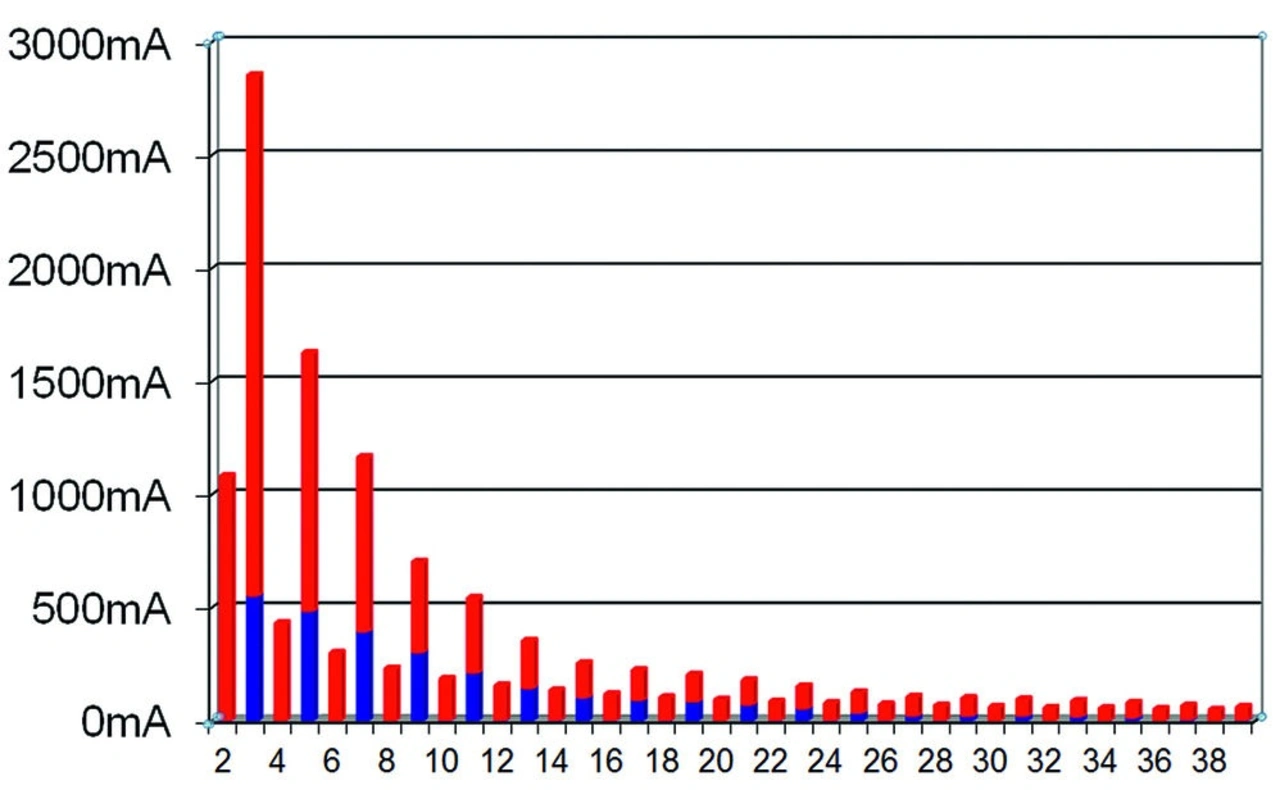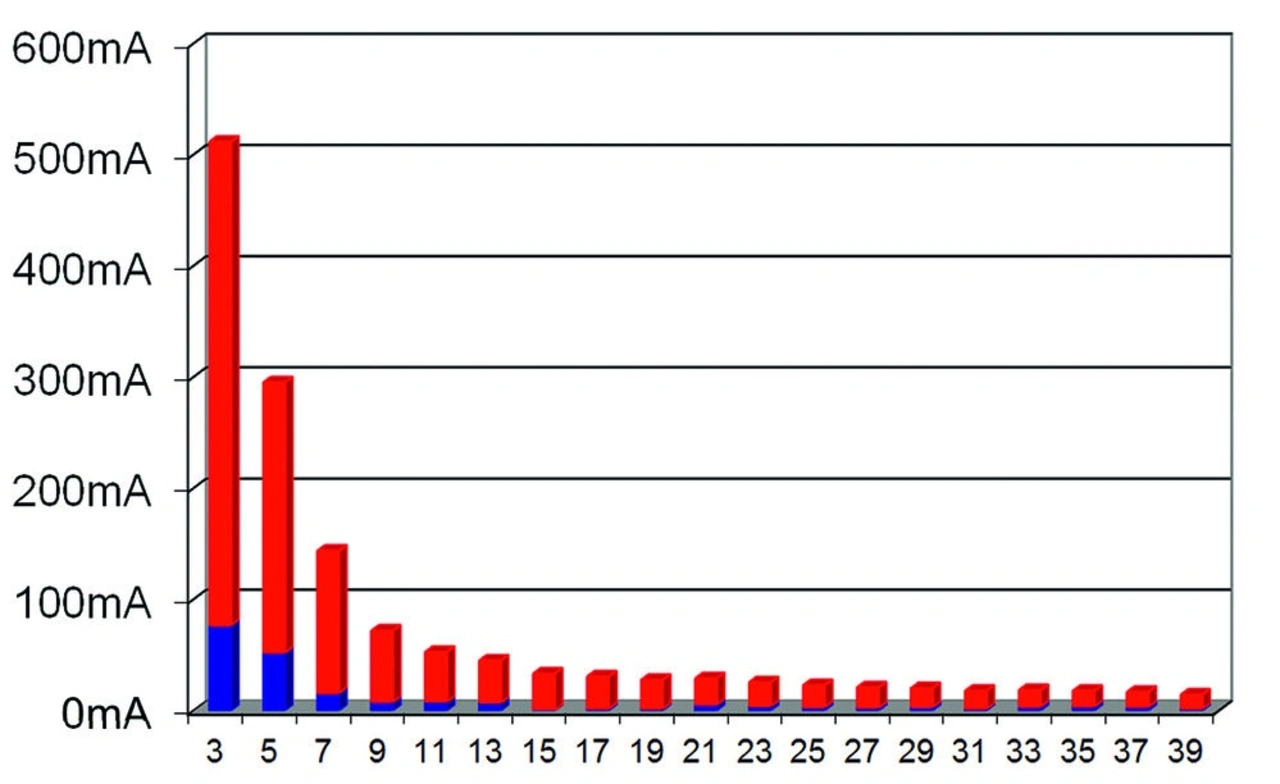 Die Betrachtung der entsprechenden harmonischen Oberwellen gemäß IEC 61000-3-2 aus Bild 5 ergibt ein Ergebnis, das in Bild 6 zu sehen ist. Wie wirkt sich dies nun auf Messungen der Eingangsleistung in der Praxis aus?