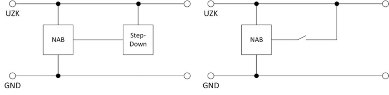 Bei der weiterentwickelten Schaltung erfolgt die Anbindung an den Hauptpfad des Netzteils über einen Schalter oder einen Step-down-Wandler. Beide Anbindungsvarianten sorgen dafür, dass Strom aus der NAB-Schaltung nur beim Netzausfall fließt. Mit dem Step-down-Wandler gelingt dies, indem die Spannung am Ausgang der NAB-Schaltung heruntertransformiert wird. Damit liegt die Spannung in der Zusatzschaltung deutlich unter der Spannung im Hauptpfad. Erst wenn das Spannungsniveau im Hauptpfad unter das Niveau der NAB-Schaltung fällt, springt die Zusatzschaltung mit der in den Kondensatoren gespeicherten Energie ein.