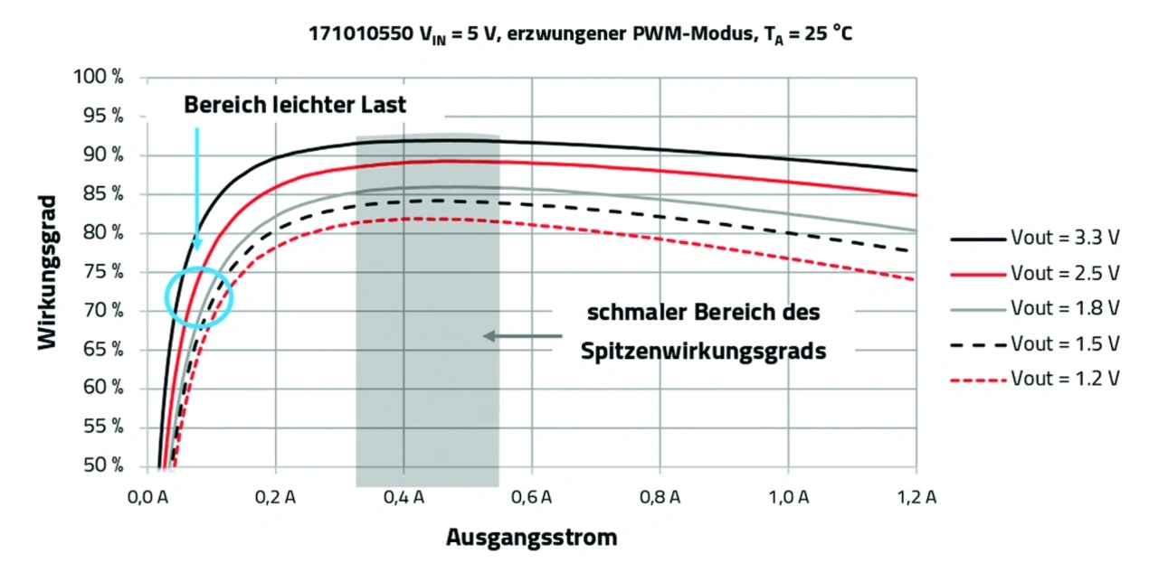 Bild 1 zeigt den Wirkungsgrad des 1,2-A-MagI3C-MicroModuls 171010550 als Beispiel für die oben beschriebene Situation einer schweren Last. Man sieht das typische Verhalten, das von Standardabwärtswandlern zu erwarten ist, die im Pulsbreitenmodulationsmodus (PWM) arbeiten. Der erzwungene PWM-Modus ist weit verbreitet und kommt in den meisten industriellen Netzteilen zum Einsatz. Diese Betriebsart ist für diese Anwendungen zufriedenstellend, weil sie während des größten Teils ihrer Lebensdauer unter schweren Lastbedingungen arbeiten.