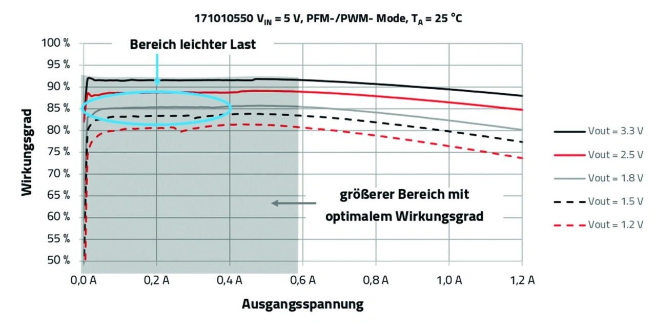 Zudem ist der Wirkungsgrad im PFM-Modus aufgrund der geringeren Schaltverluste deutlich höher als im herkömmlichen PWM-Modus. Die Leerlaufzeit ist umgekehrt proportional zum Laststrom, das heißt, wenn der Laststrom steigt, verringert sich die Zeit zwischen den Pulsen. Geht die Leerlaufzeit gegen Null, schaltet das Modul vom PFM- in den PWM-Modus zurück und kehrt zu einem konstanten Schaltverhalten bei der Standardschaltfrequenz von 4 MHz zurück.
