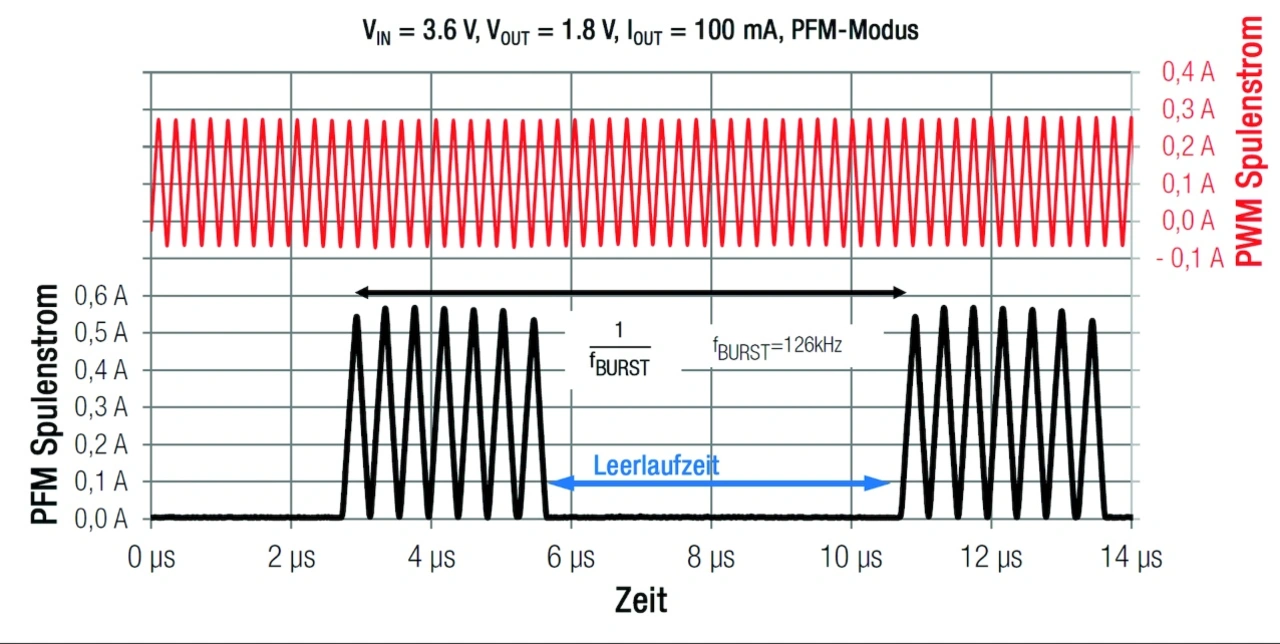 Ist die Ausgangsspannung höher als ein bestimmter Wert, bleiben beide Schalter ausgeschaltet. Da der Ausgangskondensator die einzige Versorgungsquelle für die Last ist, nimmt die Ausgangsspannung mit der Zeit ab. Wenn die Ausgangsspannung auf einen bestimmten Wert abfällt, beginnt der nächste Pulszyklus. Dabei hängt der resultierende Wert des Ripple-Stroms vom Schwellenwert ab, der intern vom Controller-IC eingestellt wird. Durch die einfache Vergrößerung des Ausgangskondensators lässt sich der Ausgangsspannungs-Ripple im PFM-Modus reduzieren. Dem Datenblatt des Power-Moduls lässt sich dabei der Maximalwert für den Ausgangskondensator entnehmen.