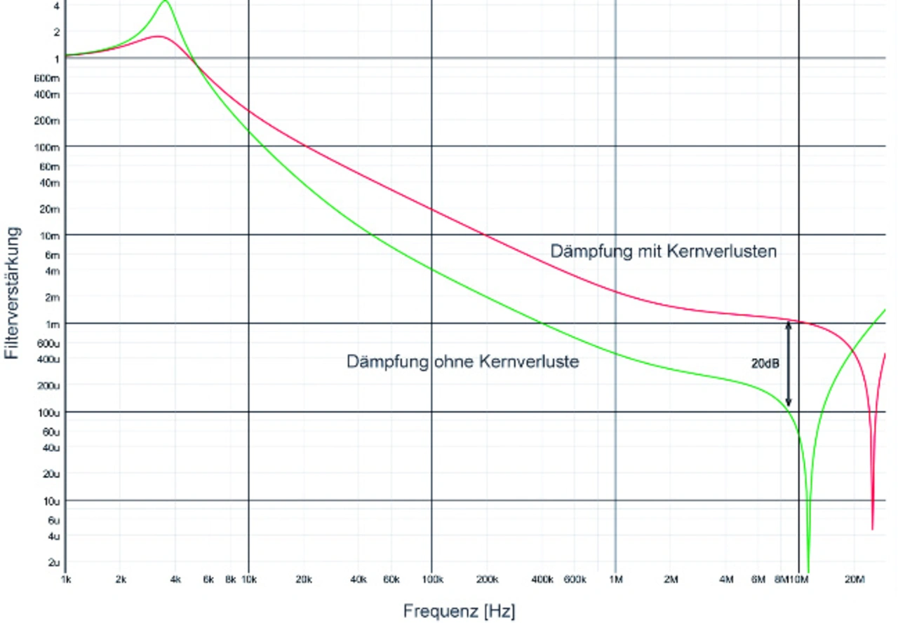 LLOSS1 und LLOSS2 zusammen mit RLOSS1 und RLOSS2 sind ein vereinfachter Weg zur Einbeziehung des Effekts frequenzabhängiger Kernverluste im Stromkreis – unterschiedliche Werte von LLOSS ergeben unterschiedliche Impedanzen, wodurch unterschiedliche Widerstände RLOSS eine Auswirkung bei unterschiedlichen Frequenzen haben. Zur Verfeinerung des Modells lassen sich weitere LLOSS/ RLOSS-Netzwerke hinzufügen, aber die Werte der Komponenten sind aus den Informationen des Datenblattes des Induktors bislang schwierig zu berechnen, sodass die Werte für einen bestimmten Induktor und einen Kern empirisch ermittelt werden. Bild 3 zeigt ein Simulationsergebnis der Dämpfung eines Filter mit und ohne LLOSS/RLOSS-Netzwerke mit einigen angenommenen Werten für L und C und deren parasitären Anteilen und zeigt, dass der Kernverlust eine starke Auswirkung auf die Dämpfung hochfrequenter Störungen haben kann – in diesem Fall einen Unterschied von 20 dB bei etwa 10 MHz. Leider steht der Kernverlust nicht in typischen Datenblättern von Induktoren und kann stark variieren.