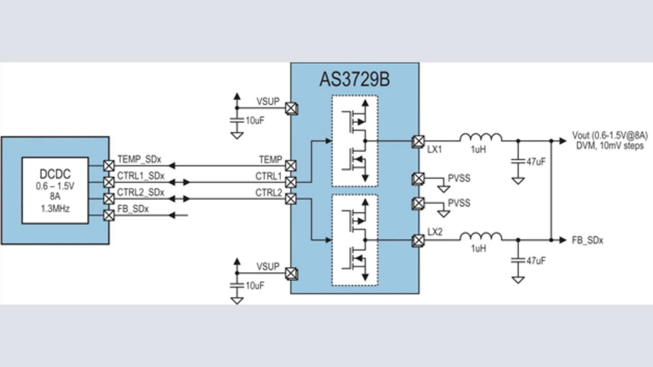 So wird zum Beispiel in der letzten Generation von Leistungsschaltern von ams ein MOSFET mit einer Waffelstruktur in einem Standard-CMOS-Prozess realisiert. Die Waffelstruktur zeichnet sich durch ihren äußerst geringen Einschaltwiderstand RDS(on) und eine hohe Anzahl von Kontaktpunkten in jedem stromführenden Weg aus. Beide Eigenschaften reduzieren die Widerstandsverluste. Der MOSFET im »AS3729B« nutzt diese vorteilhafte neue Waffelstruktur. Er ist zum Einsatz in den Leistungskreisen gedacht, welche die großen Anwendungsprozessoren in batteriebetriebenen Geräten wie Tablets und Smartphones versorgen. Er ermöglicht Spitzenlasten von 8 A, und sein Wirkungsgrad beträgt in der Spitze über 90%. Dabei ist er in seinem WLP-Gehäuse gerade einmal 1,615 mm x 1,615 mm groß. Das Bauteil hat zwei Kanäle mit einer Spitzenlast von 4 A pro Kanal (Bild 2). Jeder Schalteranschluss ist symmetrisch mit zwei Kontakten am Bauteil verbunden, der Spitzenstrom pro Kontakt beträgt demzufolge 2 A. Dieser relativ geringe Wert trägt dazu bei, die Widerstandsverluste unterhalb dessen zu halten, was man normalerweise bei einem MOSFET für Schaltleistungen von 8 A erwarten würde.