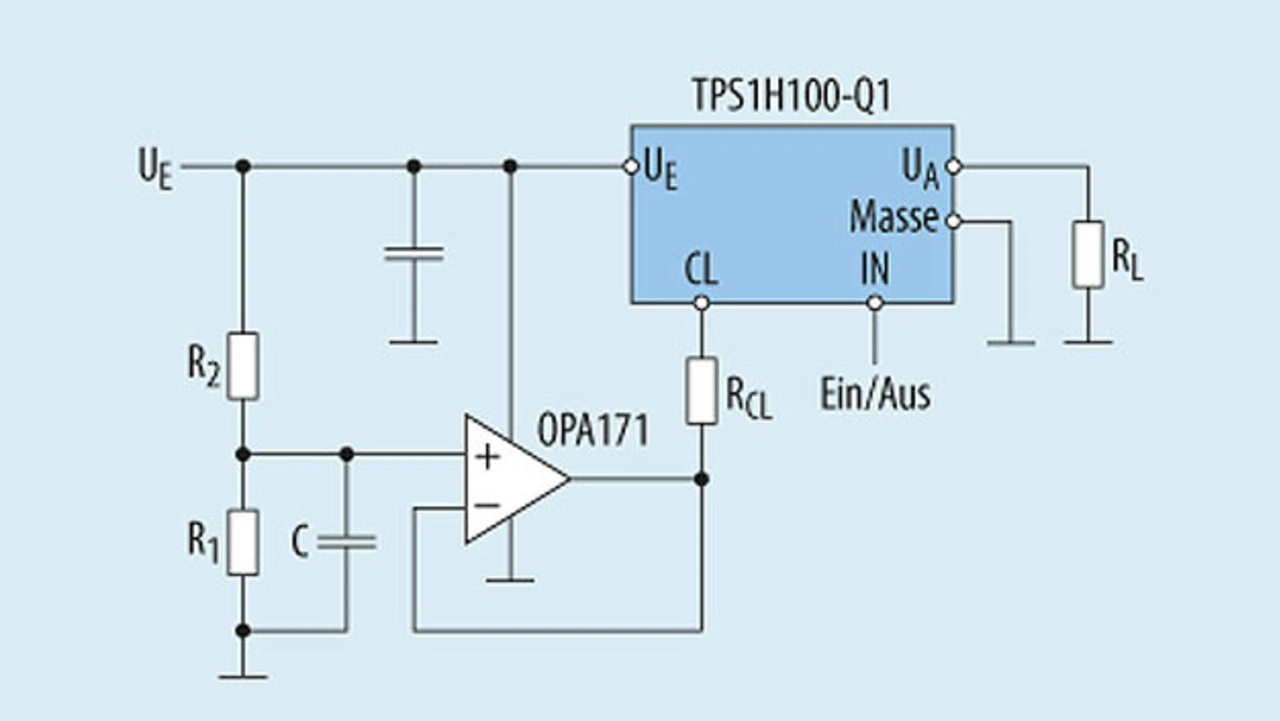 Der Ausgang des Operationsverstärkers wird mit dem Widerstand RCL verbunden. Die Spannung über RCL hängt nun also einerseits von dem durch ihn fließenden gespiegelten Laststrom (IA/KCL) ab, andererseits aber auch von der Spannung, die durch den geteilten UE-Wert bestimmt wird. Wenn UE ansteigt oder abnimmt, wird auch die Ausgangsspannung des Operationsverstärkers größer bzw. kleiner, sodass der TPS1H100-Q1 bei einem niedrigeren bzw. einem höheren Strom als zuvor in den Strombegrenzungsmodus wechselt. Da die Strombegrenzung also durch UE moduliert wird, arbeitet diese Schaltung näherungsweise als Leistungsbegrenzung.