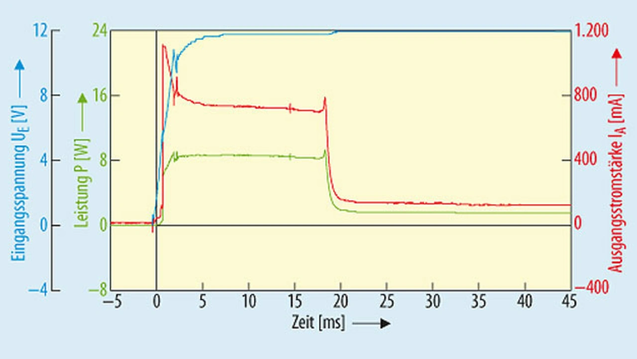 Eine moderate Überlast von beispielsweise 10 Ω ergibt einen normalen Betrieb, bis UE auf über 9 V ansteigt. An diesem Punkt wird die Maximalleistung erreicht, sodass die Schaltung anschließend in die Leistungsbegrenzung übergeht (Bild 3).