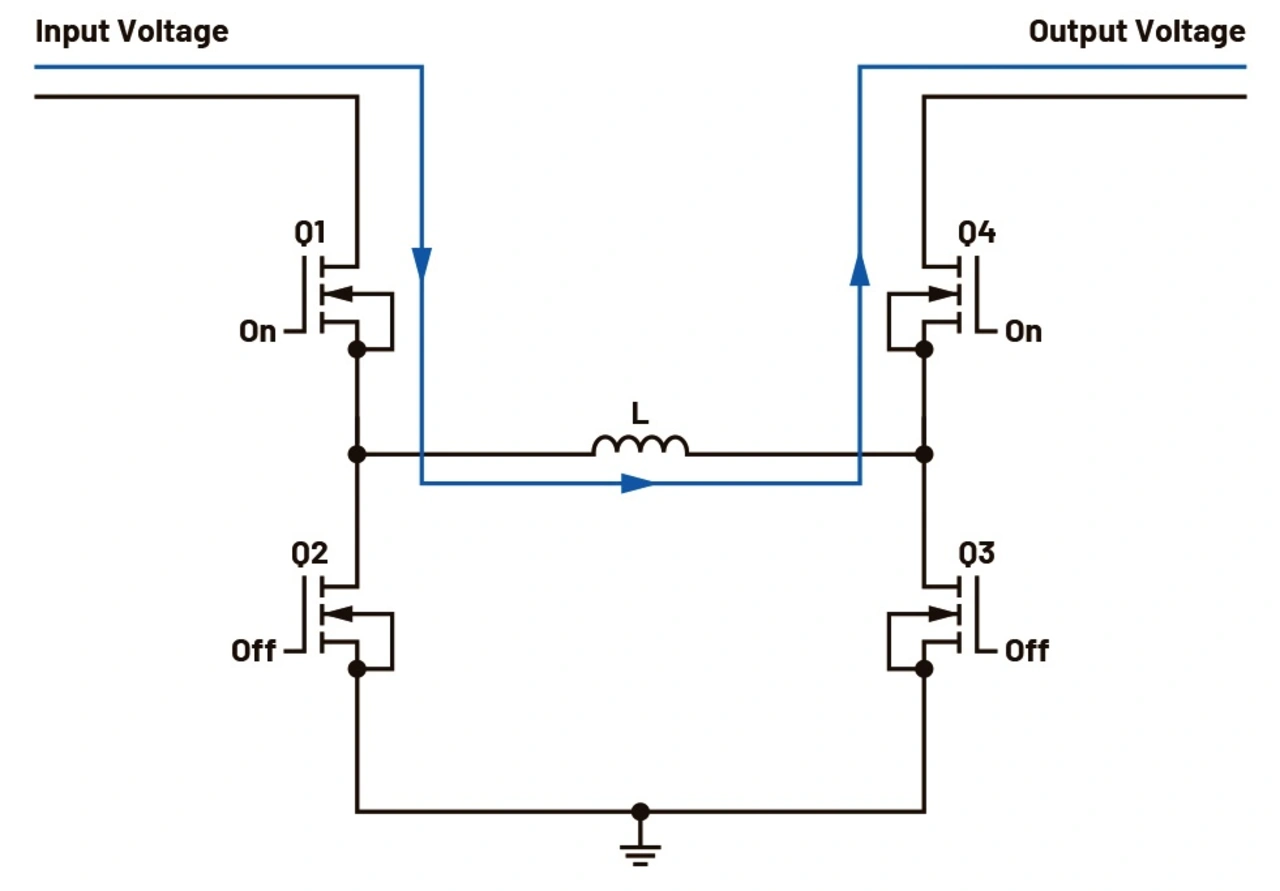Der PassThru-Modus in einem Buck-Boost-Wandler mit vier Schaltern bietet einen direkten Pfad von der Stromquelle zur Ausgangslast, sobald die Spannung in dem im PassThru-Fenster festgelegten Bereich liegt (Bild 2). Genau dann wird der Eingang direkt an den Ausgang weitergeleitet. Damit verbessert sich der Wirkungsgrad im festgelegten PassThru-Fenster, denn in diesem Modus wird nichts geschaltet, es treten also keine Schaltverluste auf und auch die elektromagnetische Verträglichkeit verbessert sich.