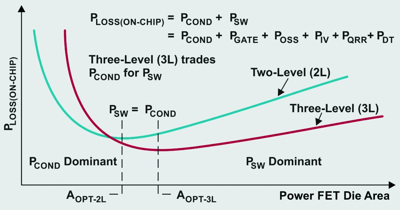 Wie in der Spalte ganz rechts in Tabelle 1 dargestellt, verdoppeln sich bei gleicher Chipfläche die Durchlass- und Totzeitverluste der 3-Level-Topologie. Da an den FETs in der 3-Level-Topologie jedoch nur die Hälfte der Eingangsspannung im Vergleich zur 2-Level-Topologie anliegt, halbieren sich die POSS- und PIV-Verluste. Durch eine größere FET-Fläche lassen sich die Durchlassverluste senken, bis die Schaltverluste zu dominieren beginnen (Bild 5). Die optimalen FET-Flächen (AOPT-2L, AOPT-3L) liegen dort, wo die Schaltverluste genauso groß sind wie die Durchlassverluste.