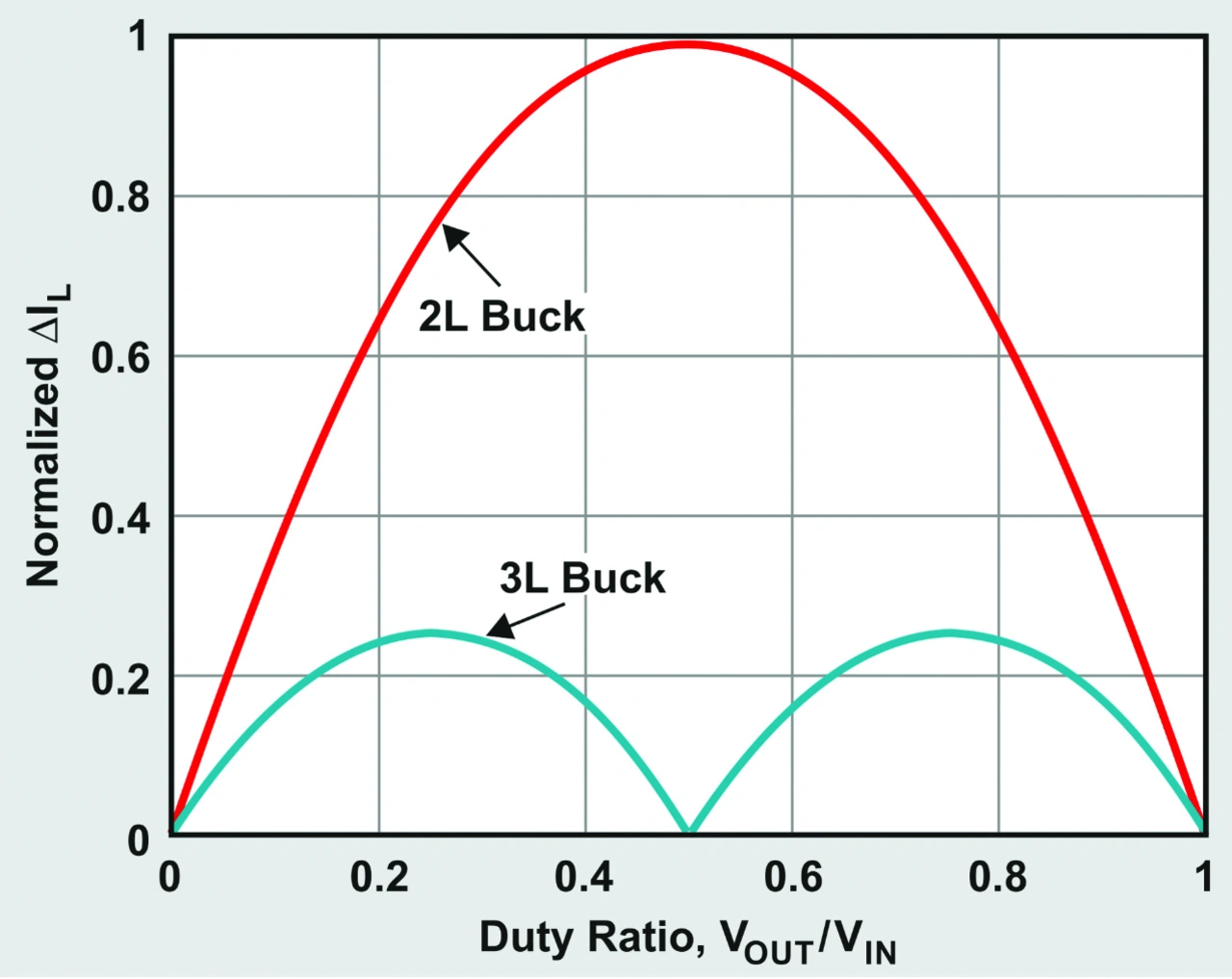 Diese letzte Gleichung bestätigt, dass sich die Welligkeit des Spulenstroms nur wenig auf die Kupferverluste PDCR auswirkt. Genauso wie schon beim 2-Level-Wandler verlangt auch der 3-Level-Wandler nach einer Induktivität mit niedrigerem Gleichstromwiderstand, um einen höheren Wirkungsgrad zu erreichen. Wie bereits erläutert, verringert die 3-Level-Topologie prinzipbedingt die Welligkeit des Spulenstroms auf ein Viertel. Kann die Applikation mit der gleichen Welligkeit des Spulenstroms und der daraus resultierende Welligkeit der Ausgangsspannung einer vergleichbaren 2-Level-Wandlers bei gleicher Schaltfrequenz leben, dann kann eine Spule mit einem Viertel der Induktivität eingesetzt werden, was deutlich geringere Abmessungen ergibt.