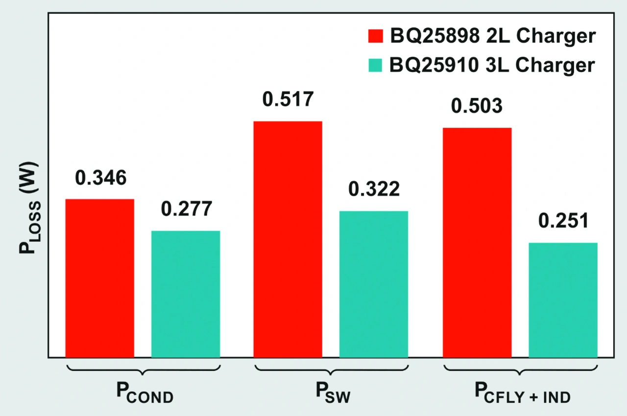 Ungeachtet der zusätzlichen Bauelemente reduziert sich der Flächenbedarf der Lösung mit dem BQ25910 bei ähnlichem DCR der Spulen und das Fehlen des Batterie-FET um rund 36 %. Bild 7 zeigt die Verluste für den BQ25910 und den BQ25898 auf der Basis von Werten, die aus den Gleichungen aus Tabelle 1 berechnet worden sind. Hervorzuheben ist die Tatsache, dass die DCR-Verluste bei beiden Lösungen den größten Anteil an den Gesamtverlusten haben.