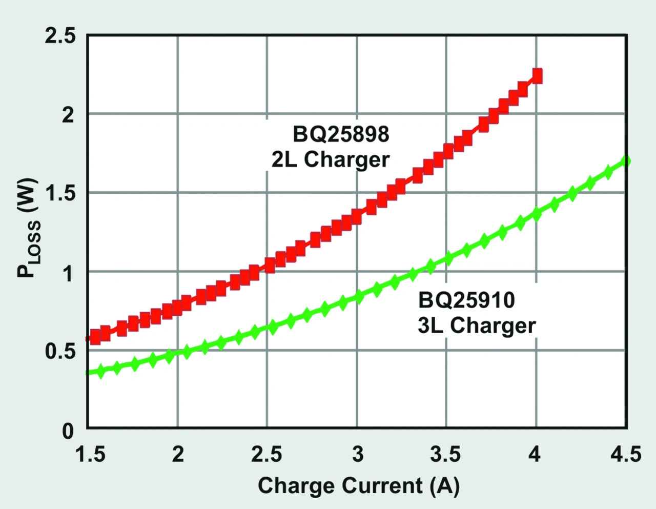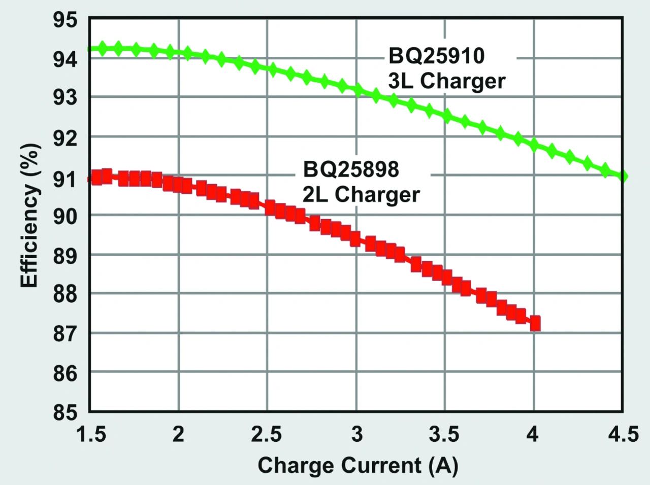 Bei einer Eingangsspannung von 9 V, einer Batteriespannung von 3,8 V und einem Ladestrom von 3 A verbessert der 3-Level-Baustein BQ25910 den Wirkungsgrad gegenüber dem 2-Level-Baustein BQ25898 um 3,9 Prozentpunkte, während die Verlustleistung um 36 % sinkt. Anders ausgedrückt: Bei einem Verlustleistungsbudget von 1,5 W kann der BQ25898 einen Ladestrom von 3,2 A liefern, während es im Fall des BQ25910 4,2 A sind. Dies entspricht einem Plus von 31 %, gleichzeitig verringern sich die Abmessungen der Lösung um 36 %.