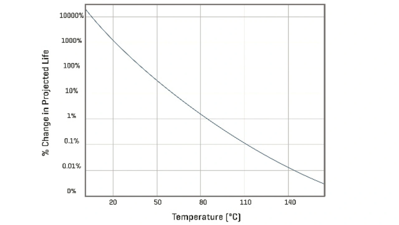Bauelemente zu verwenden, die weit unter ihren Nennspezifikationen liegt, ist eine einfache Methode, um die Zuverlässigkeit zu steigern. Diese Methode ist als Derating bekannt. Betreibt man beispielsweise ein Bauteil, das für einen zuverlässigen Betrieb bei +85 °C ausgelegt ist, nur bei +55°C, dann steigt die Zuverlässigkeit. Als Faustregel gilt, dass sich die Lebensdauer eines Bauteils bei jedem Temperaturabfall um 10 K verdoppelt. Diese Beziehung zwischen Temperatur und Lebensdauer basiert auf dem theoretischen Rahmen der Arrhenius-Gleichung, die Temperatur und Alterungsbeschleunigung in Beziehung setzt, als auch auf einer erheblichen Menge von Testdaten aus der Branche.