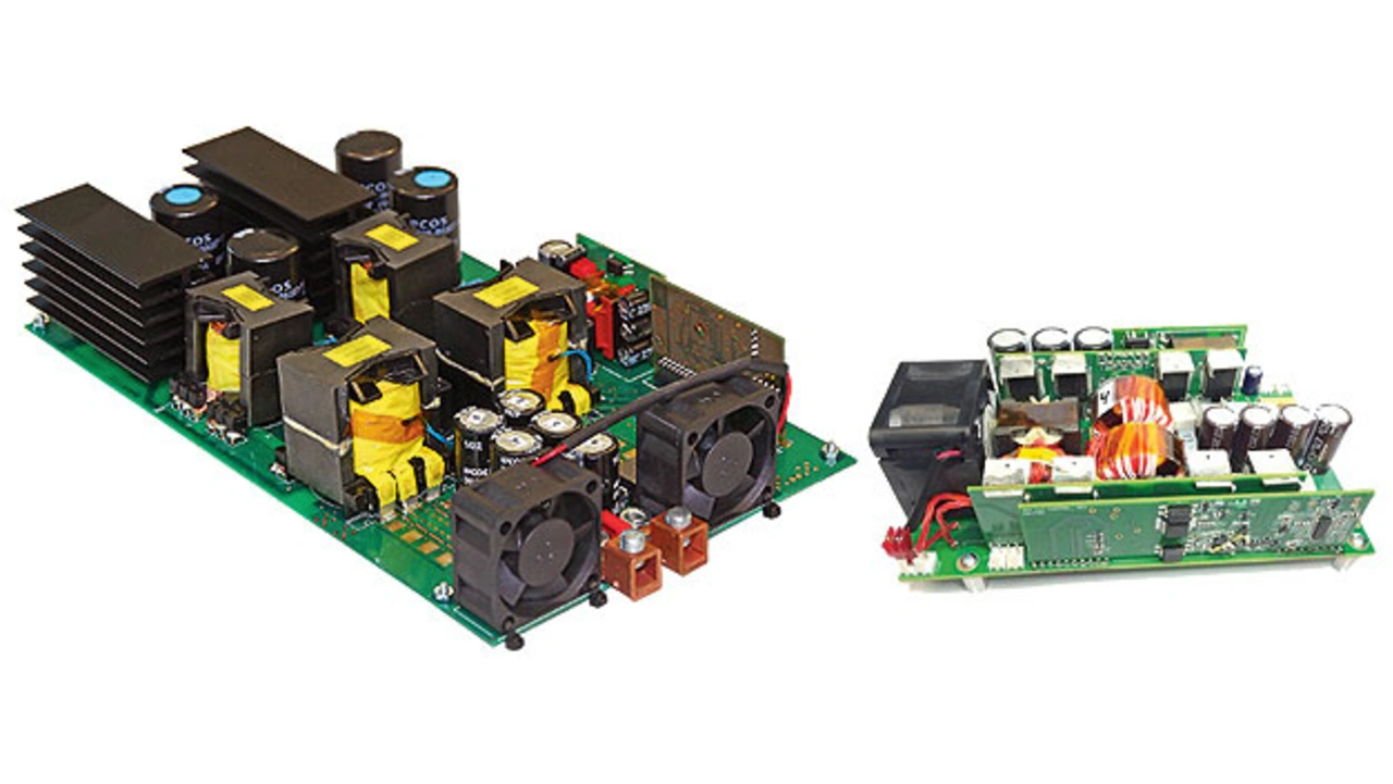 Bild 6 zeigt zwei LLC-Stromversorgungen – beide mit einer maximalen Ausgangsleistung von 3 kW aus dem Telekom-Bereich mit einer nominellen Ausgangsgleichspannung von 385 V. Beide Applikationen sind für einen hohen Wirkungsgrad ausgelegt, und ihre Effizienzkurven sind mit einem Spitzenwert von 98,3 % nahezu identisch. Der wesentliche Unterschied besteht darin, dass die Stromversorgung links primärseitig Silizium-SJ-MOSFETs mit nominal 130 kHz und die Stromversorgung im Bild rechts 600-V-GaN-HEMTs und eine Schaltfrequenz von 350 kHz nutzten. Beide Stromversorgungen verfügen über Niedervolt-Silizium-FETs für die Gleichrichtung auf der Sekundärseite. Aufgrund der etwa dreifachen Betriebsfrequenz erreicht die GaN-Stromversorgung eine Leistungsdichte von 140 W/Zoll³ (8,5 kW/l) und damit auch fast dreimal so viel wie die Stromversorgung mit Standard-Silizium-Technologie mit 50 W/Zoll³ (3 kW/l).
