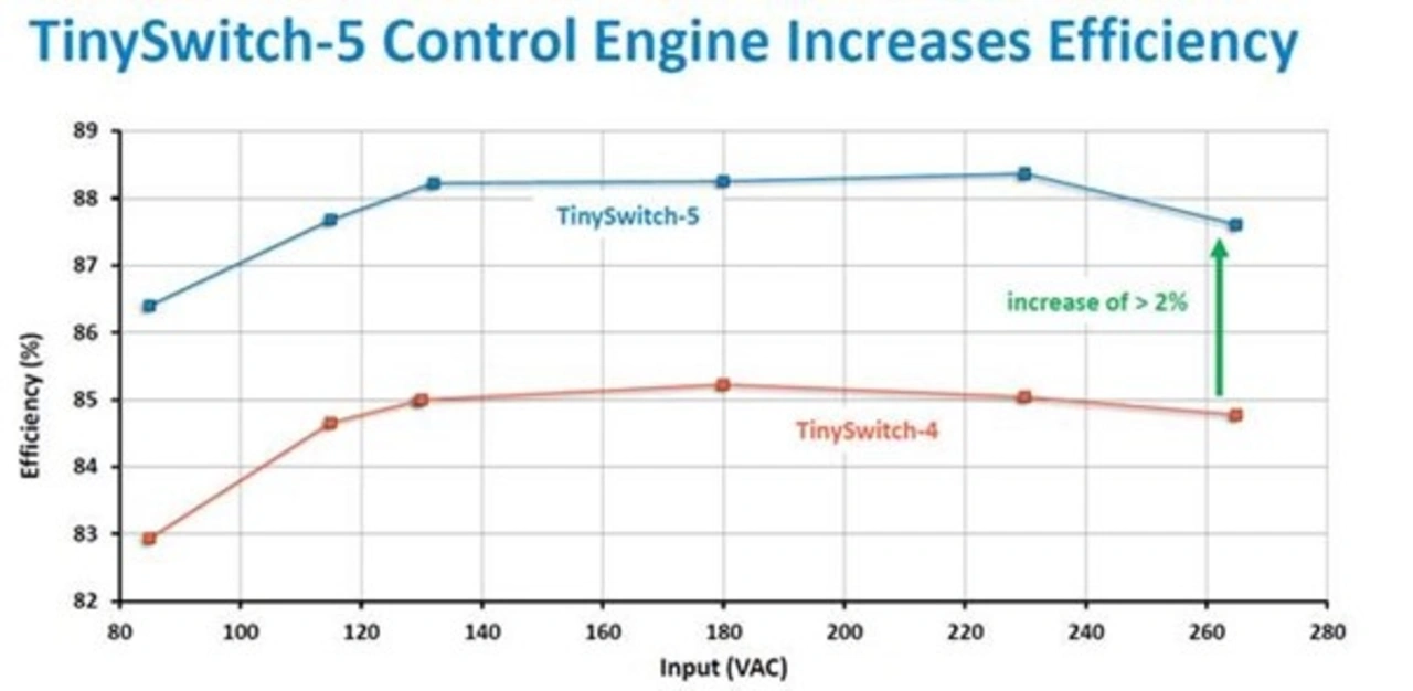 Durch die variable interne Strombegrenzung und der Schaltfrequenz des Reglers wird eine sehr hohe Effizienz im Vergleich zu den älteren TNY- oder TOP-Switch Familien erreicht.