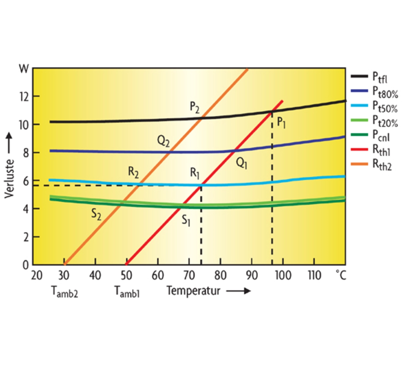 Die Betriebspunkte für Volllast, 80 % Last, 50 % Last und Leerlauf sind mit P1, Q1, R1 und S1 für eine Umgebungstemperatur von 50 °C respektive P2, Q2, R2 und S2 für eine Umgebungstemperatur von 30 °C gekennzeichnet. Aus diesen Kurven lassen sich die Veränderungen hinsichtlich Verlust und Temperaturanstieg bei Teillast bestimmen. Der Punkt R1 repräsentiert den Arbeitspunkt bei 50 % Last und einer Umgebungstemperatur von 50 °C. Die Übertragerverluste betragen 5,55 W bei einer Betriebstemperatur von 73 °C.