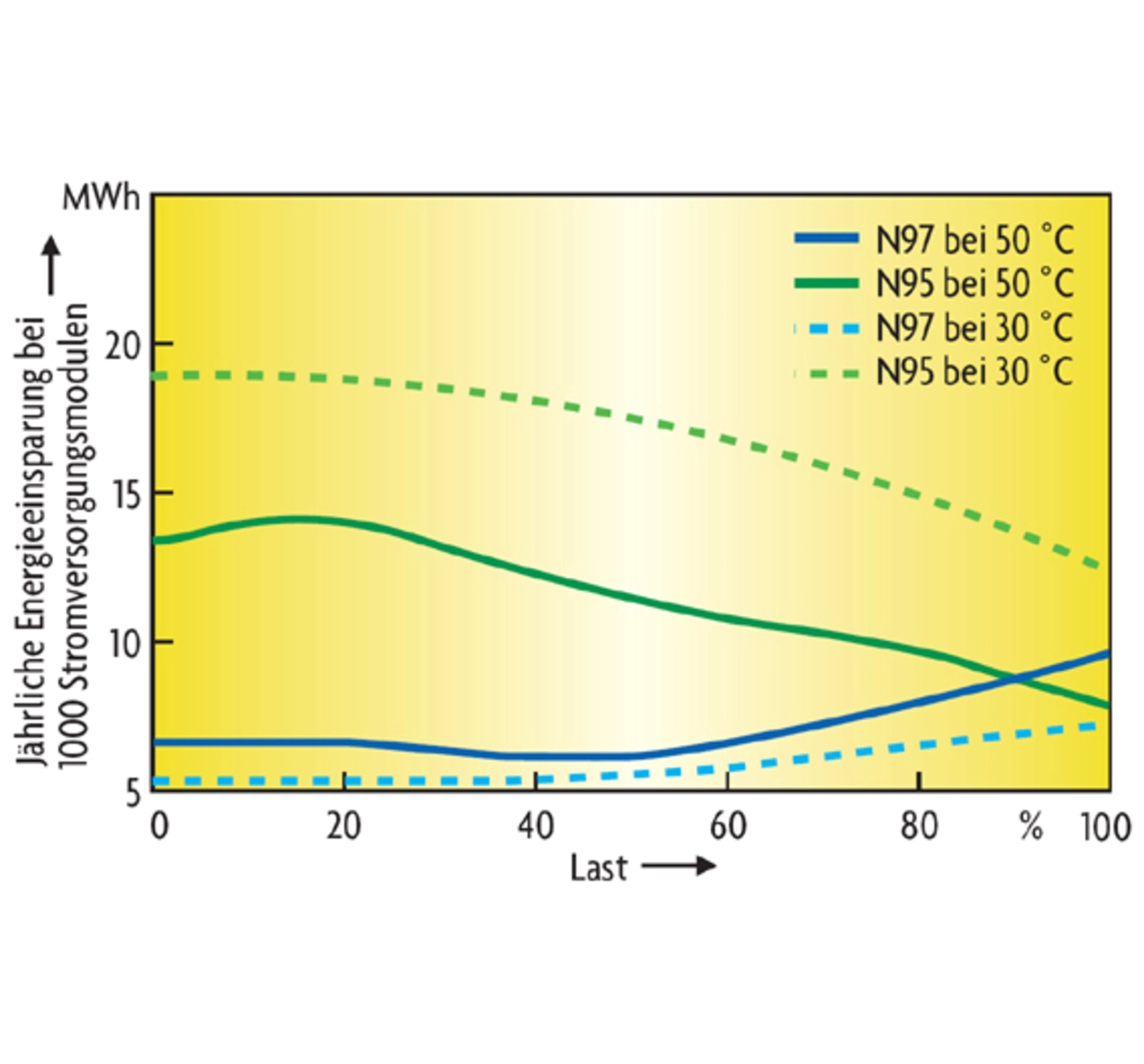 Die Energieeinsparung bei niedriger Umgebungstemperatur ist bei N95 größer als bei N97 (Bild 4). Ein Temperaturanstieg spielt also stets eine wesentliche Rolle bei den Energieeinsparungen, zumal sich die Stromversorgungen für Server-Anwendungen in den meisten Fällen in einer klimatisierten Umgebung befinden. Der Leistungsbedarf einer herkömmlichen Klimaanlage liegt bei rund 3,5 kW pro Tonne klimatisierter Luft und erhöht sich proportional mit steigender Temperatur. Da macht es doch mehr als Sinn, wenn man bei den verwendeten Stromversorgungen N87-Ferritkerne durch solche mit N95-Ferritkernen austauscht und auf diese Weise 830 kWh pro Tonne Luft und Jahr allein bei der Klimaanlage einspart.
