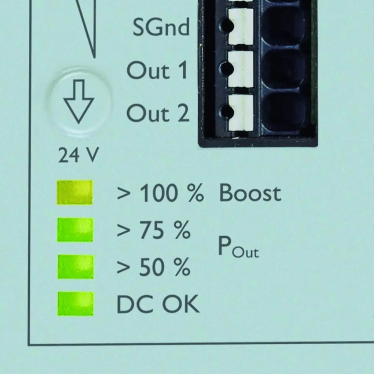 Um eine maximale Anlagenverfügbarkeit zu erzielen, ist die präventive Funktionsüberwachung zur Ferndiagnose des Netzteils sinnvoll. Durch die permanente Überwachung von Ausgangsspannung und -strom werden kritische Situationen über die frontseitig integrierte LED-Anzeige angezeigt (Bild 4) und einem potenzialfreien Relaiskontakt sowie dem aktiven Signalausgang der Steuerung gemeldet, bevor ein Problem auftritt. Liefert die Stromversorgung mehr als den zulässigen Nennstrom, befindet sie sich im Boost-Betrieb. Die Stromversorgung und die angeschlossenen Verbraucher arbeiten auch dann normal weiter, die Ausgangsspannung beträgt weiterhin z. B. 24 V.