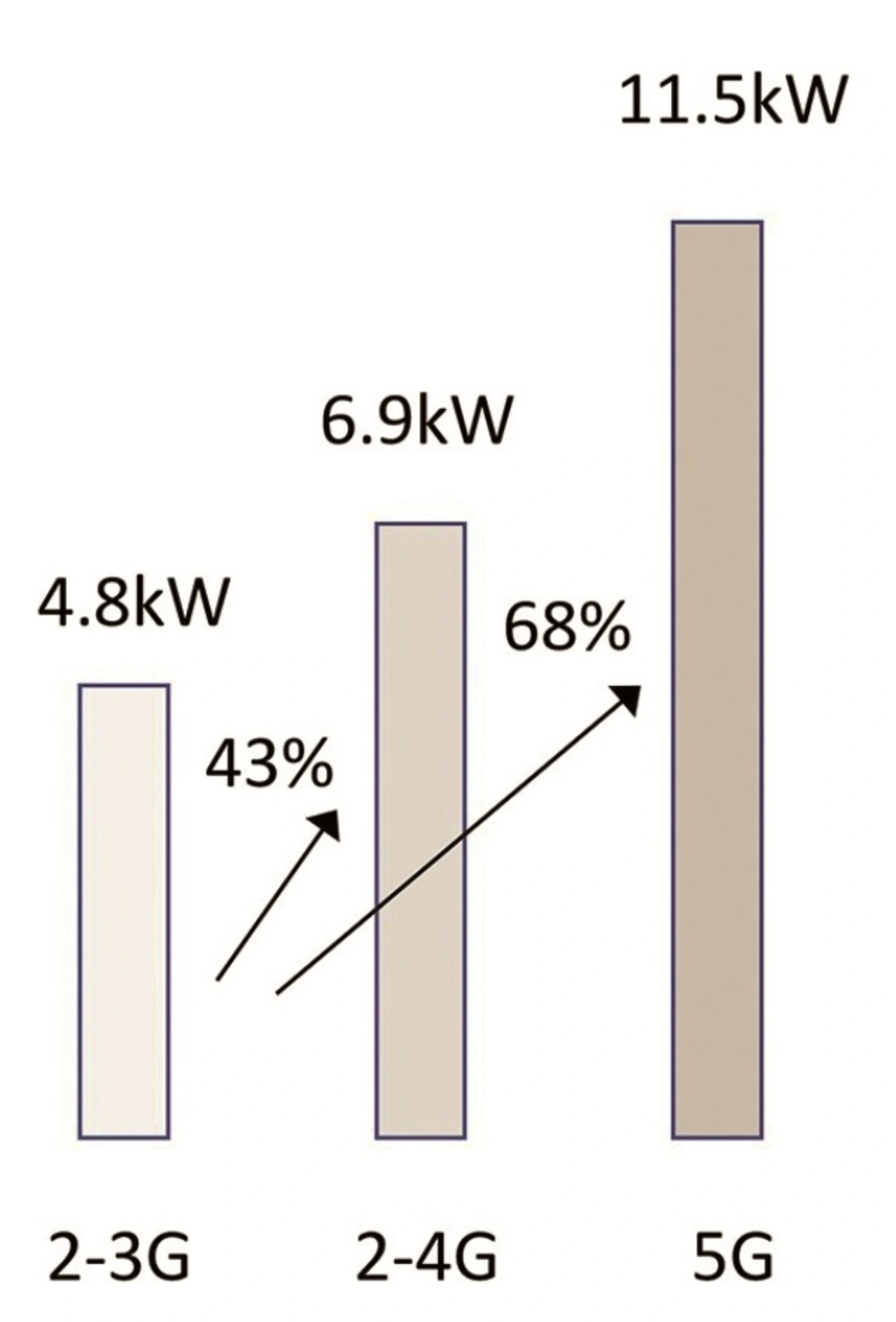 Aufgrund der höheren Leistungsfähigkeit und Komplexität von 5G benötigt ein solches System im Vergleich zu 4G in der Regel doppelt so viel oder mehr Leistung. Eine große Installation verfügt über mehrere Antennen, ältere Funkeinheiten für 2G/3G/4G sowie Steuer- und Datenverarbeitungselektronik, sodass der Gesamtleistungsaufnahme leicht über 10 kW betragen kann (Bild 1). Verbrauchsberechnungen der Telekommunikationsbetreiber sind daher zunehmend ein kritisches Thema.