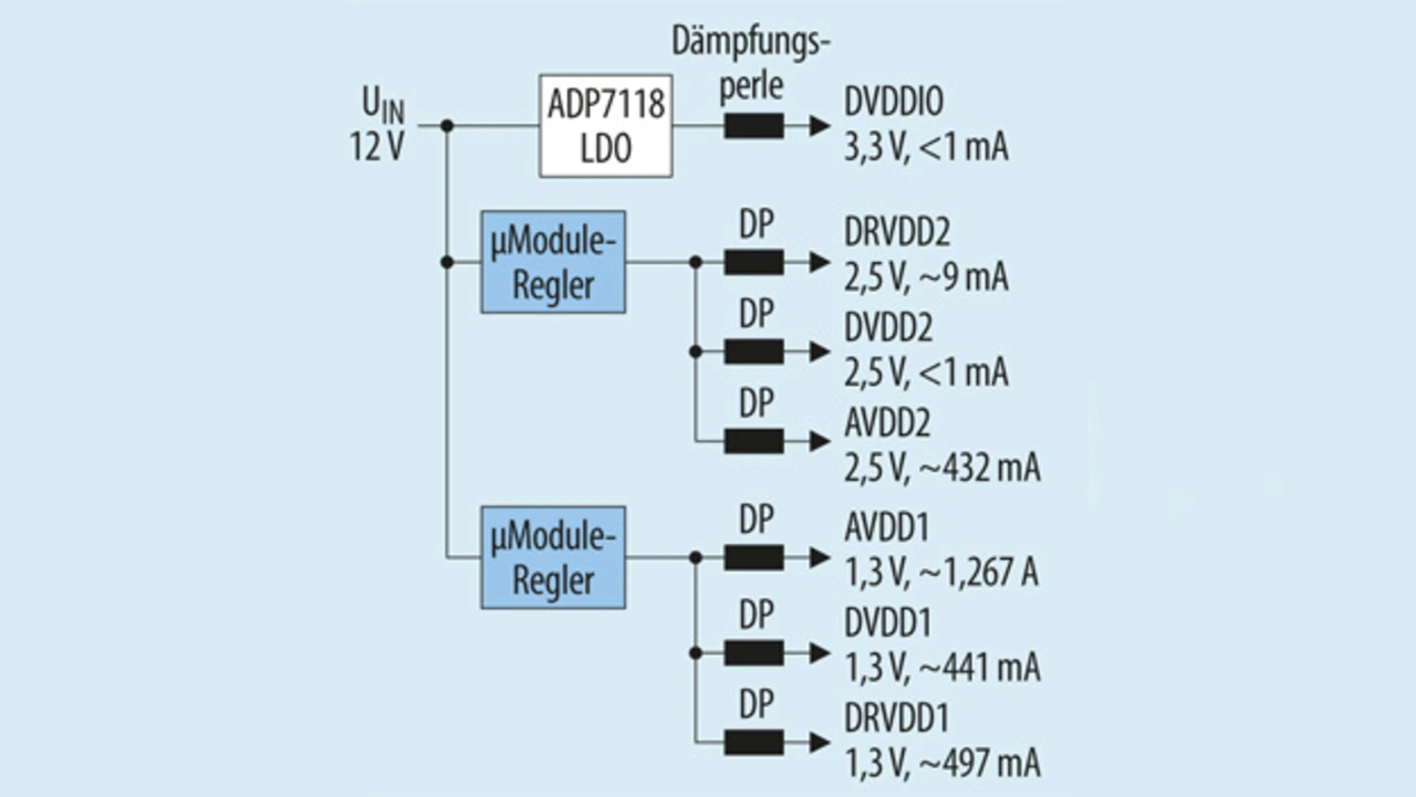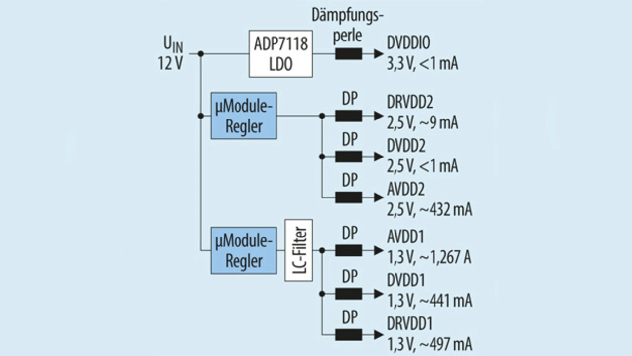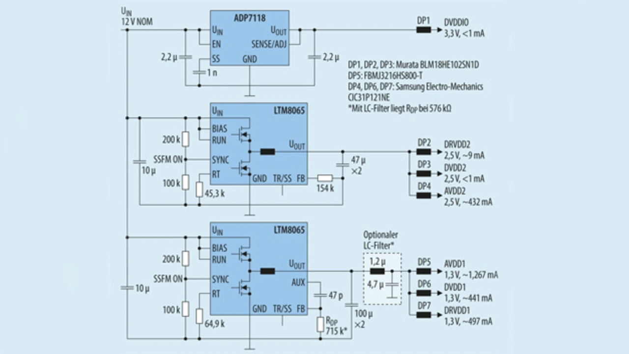 Der µModule-Regler unterstützt einen Ausgangsspannungsbereich von 0,97 V bis 18 V und einen Schaltfrequenzbereich zwischen 200 kHz und 3 MHz, wobei die Ausgangsspannung über einen einzigen externen Widerstand eingestellt wird. Die einzigen weiteren Komponenten, die zur Realisierung eines vollständigen Reglers benötigt werden, sind die Eingangs- und Ausgangskondensatoren. In dieser Lösung versorgt der LTM8065 die 1,3-V- und 2,5-V-Spannungspegel direkt. Der 3,3-V-Pegel wird direkt von einem rauscharmen LDO ADP7118 aus einer 12-V-Versorgung gespeist. Der Strom des 3,3-Versorgungspegels liegt unter 1 mA, sodass die Verlustleistung am LDO-Regler vernachlässigbar ist.